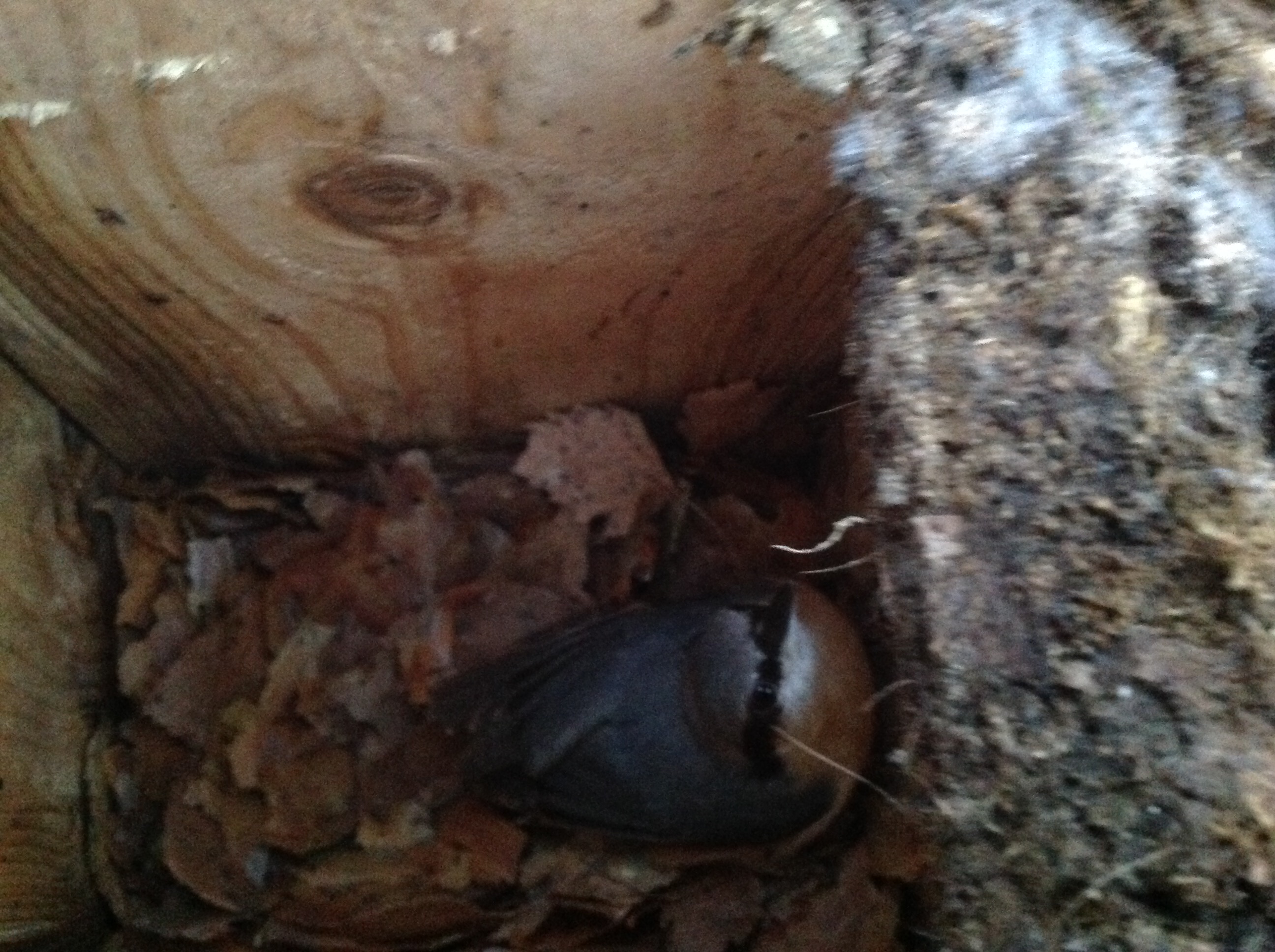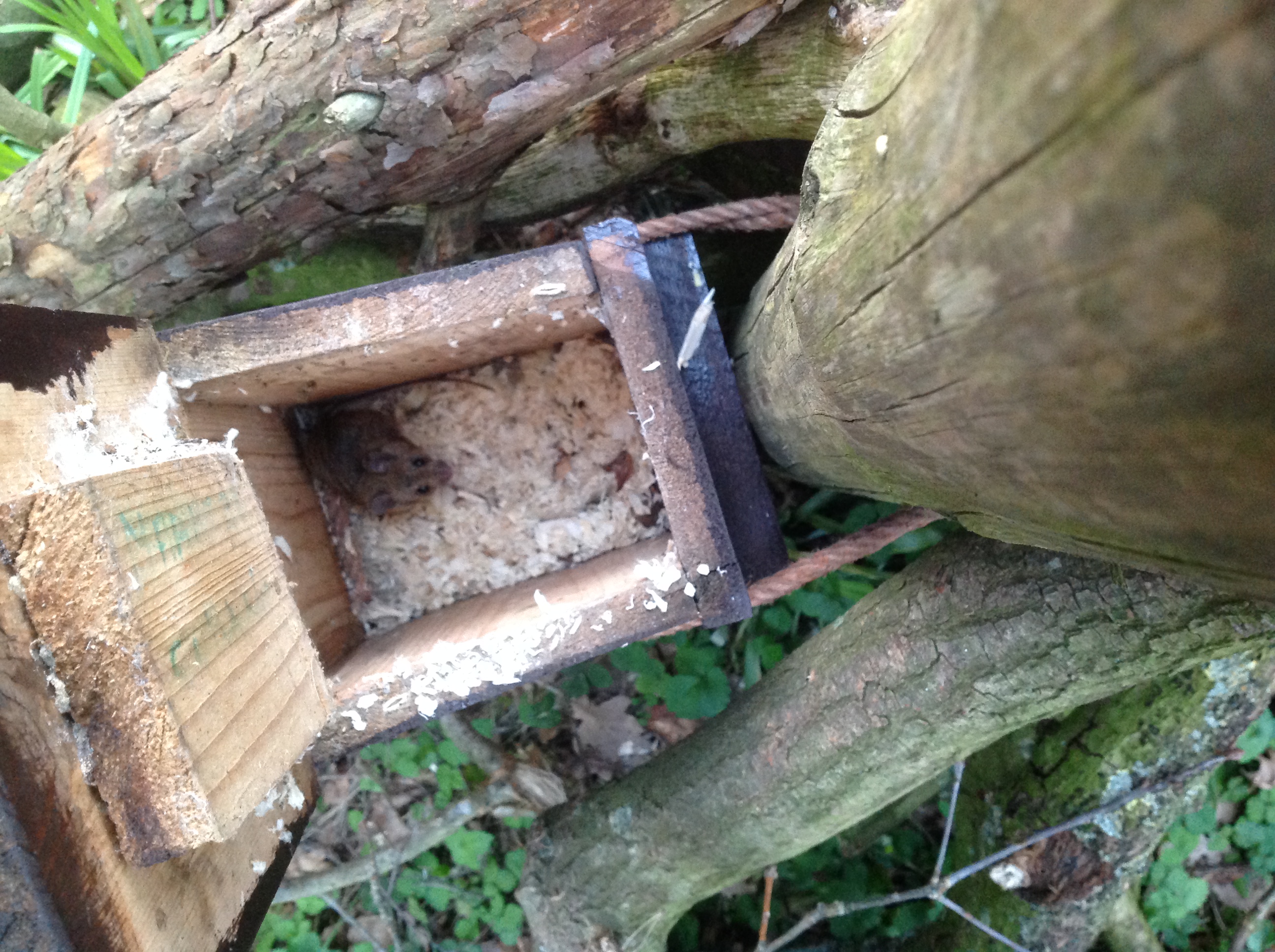Ook is er een nestkastje omgekeerd tegen een stam gehangen, gevuld met zaagsel, om als muizenhol te dienen. Leuk om af en toe met scouts in te kijken. Er is al 1 muis die het huisjes heeft ontdekt.