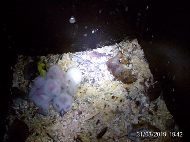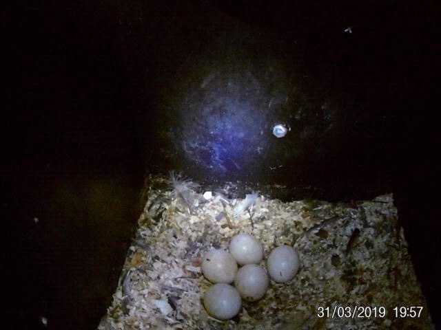 Daarnaast hebben we ook permanent 2 bosuilen kasten hangen en een valkenkast. Beide uilenkasten worden op dit moment bewoond. In de ene kast zijn 5 eieren aangetroffen. In de andere kast 1 ei en 2 of 3 jongen. Twee uilen paartje in ons Scoutingbos is een feest.