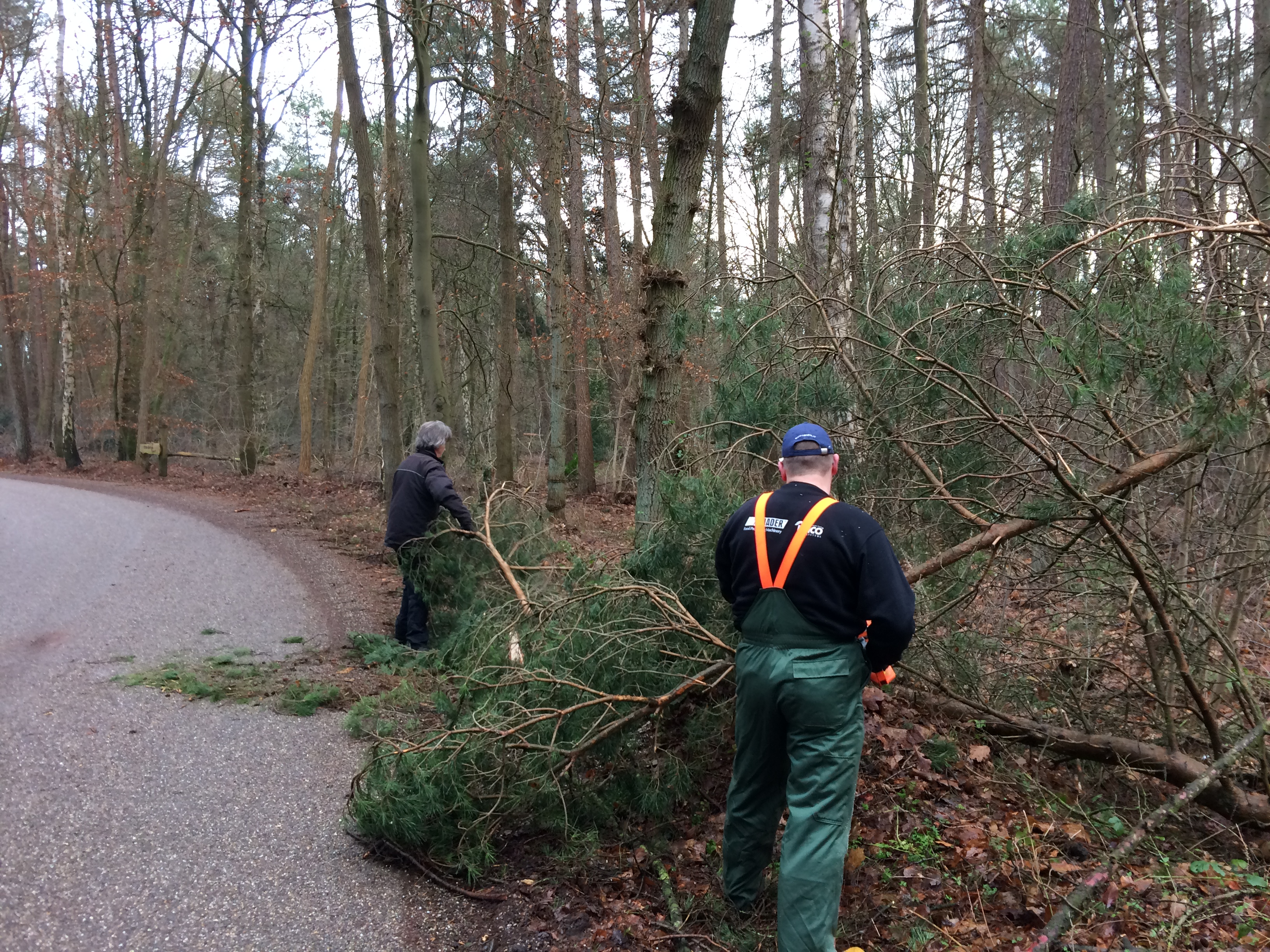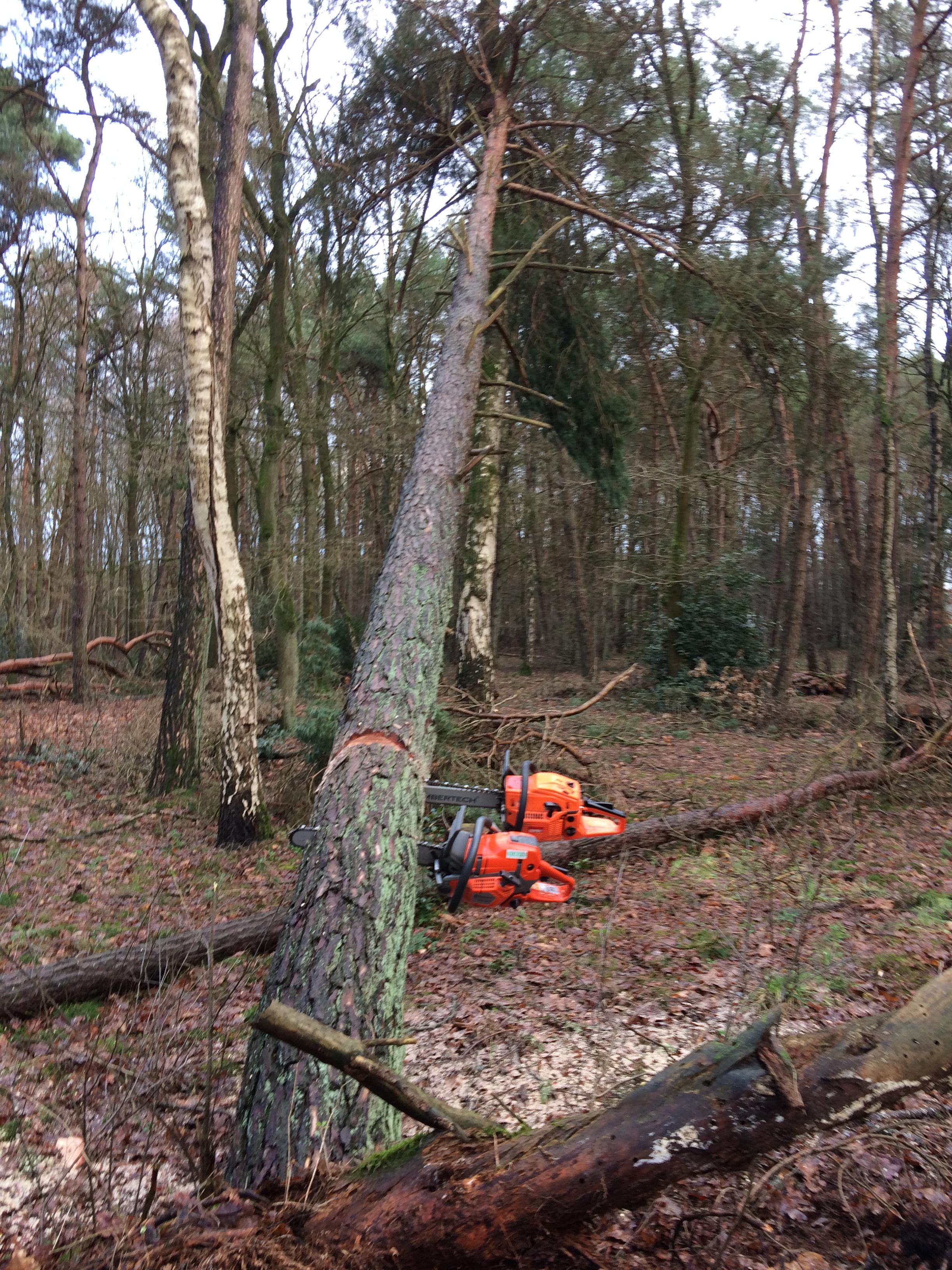 De Hei heeft er flink van langs gekregen. Verdeeld over het 7,5 ha bos zijn ruim 30 bomen gesneuveld. Overwegend grove den en berken waren het slachtoffer van deze westerstorm. Om de veiligheid van onze Scouts te garanderen heeft er vandaag een controle plaatsgevonden op gevaarlijke situaties. De boy- en girlscouts hebben dit weekend winterkamp en je wilt niet dat een half afgebroken top op een tent valt. Eddy, Henri en Richard zijn met de motorzagen aan de slag gegaan. Er lagen een paar loeders kritisch en die lieten zich niet makkelijk vloeren. Resultaat vastgeslagen motorzagen. Uiteindelijk is het gelukt.