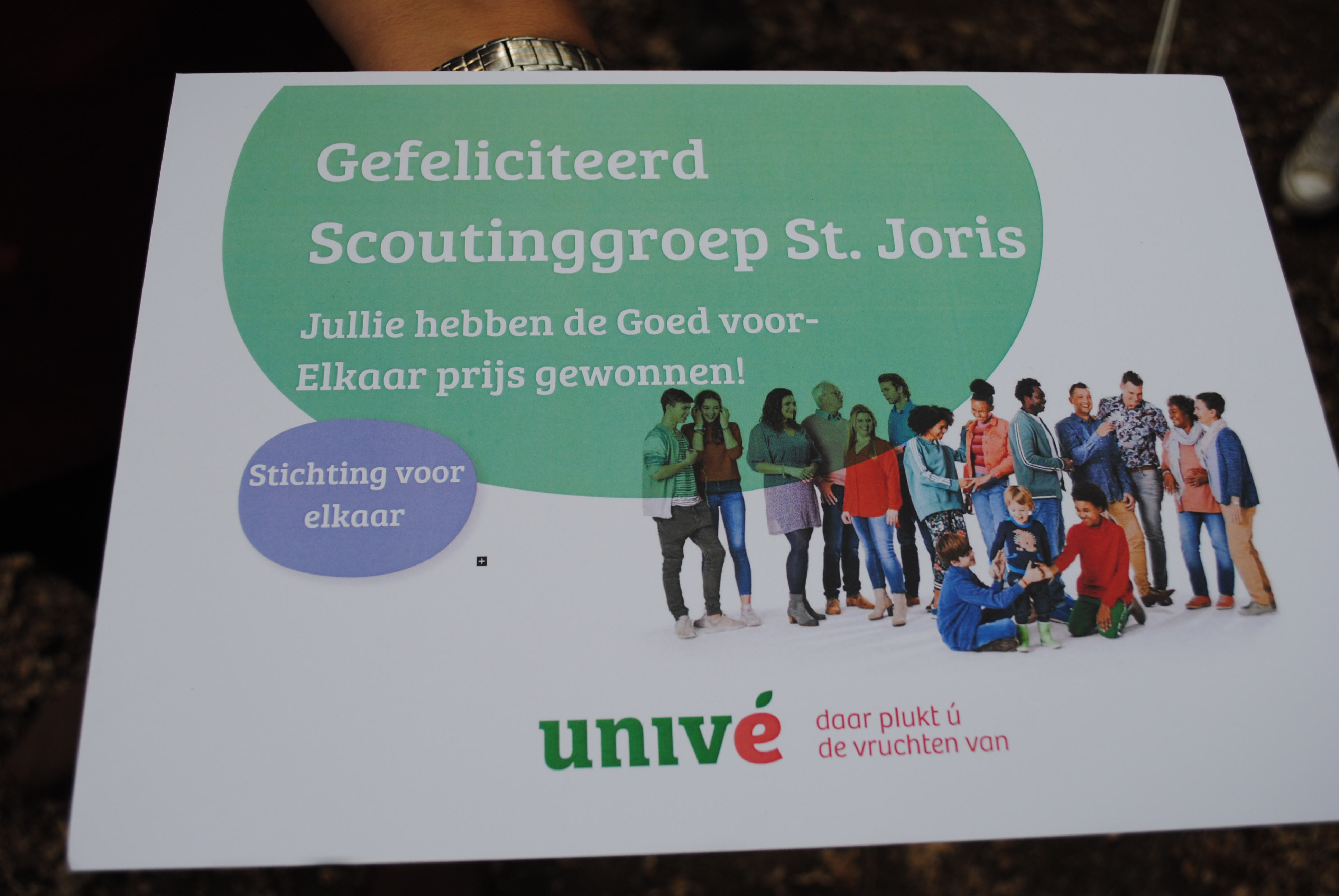 Verrast zijn wij van Scoutinggroep Sint Joris met het bericht dat de Stichting ”Voor Elkaar”, Univé Stad en Land, ons een financiële bijdrage schenkt. Dit jaar viert de groep het 85-jarig jubileum en is er gestart met een nieuwe speltak, de Bevers (jeugdleden van 5 tot 7 jaar). Zo’n mooi cadeau van “Voor Elkaar” is zeer welkom.