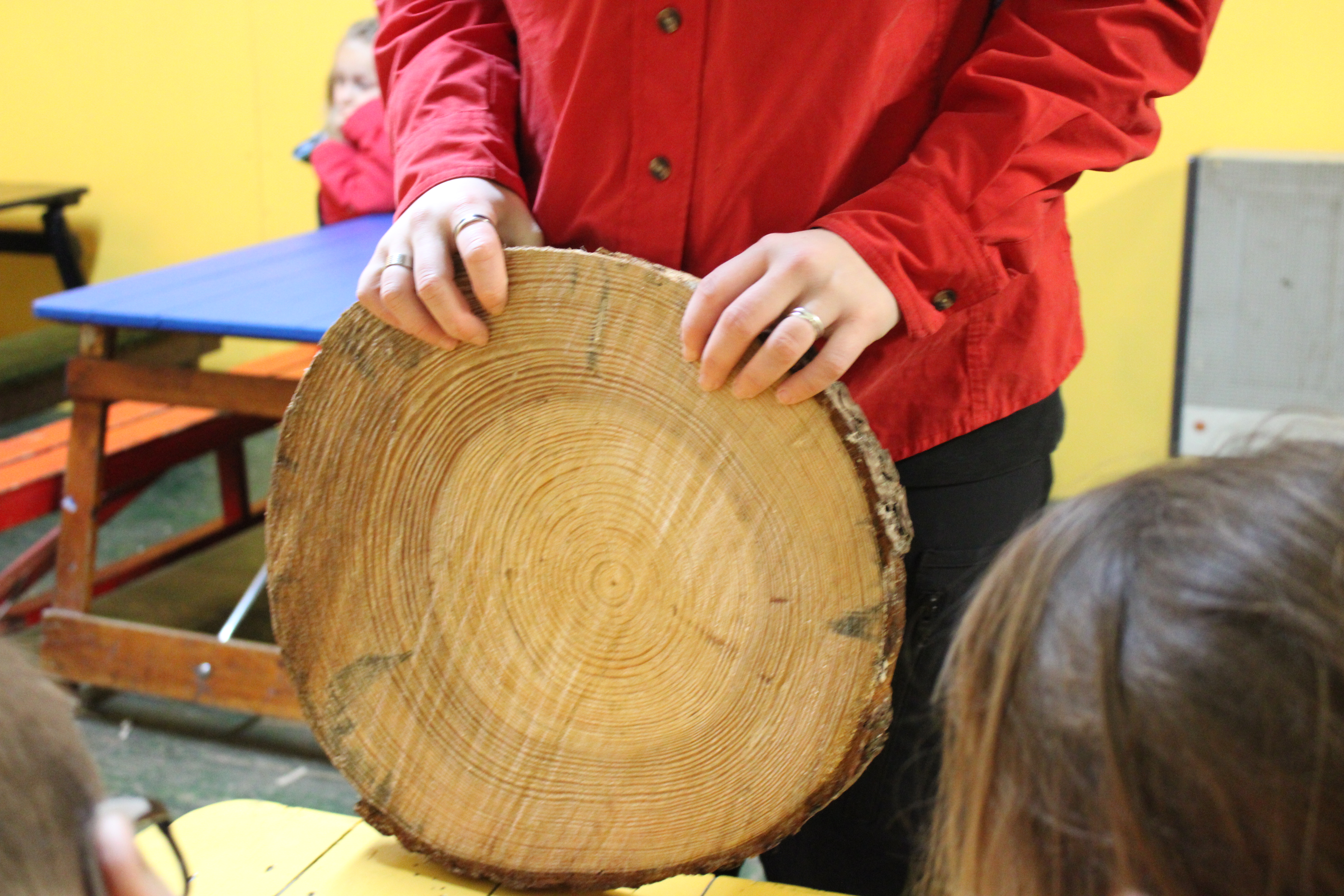 Niels heeft ons ook nog dingen geleerd over bomen. Zo weten we nu dat elke boom een andere naam heeft. We hebben geleerd hoe een appelboom, vogelkers en een krent er uit zien. Allemaal hadden ze een andere stam en Niels vertelde dat ze als het warm is buiten ook andere blaadjes hebben. Na dit stukje uitleg hebben we binnen ook nog een plakje boom bekeken. Hierop hebben we ontdekt dat de binnenkant van een boom uit allemaal ringen bestaat. Daaraan kun je zien hoe oud de boom is én hoe goed de boom heeft kunnen groeien.