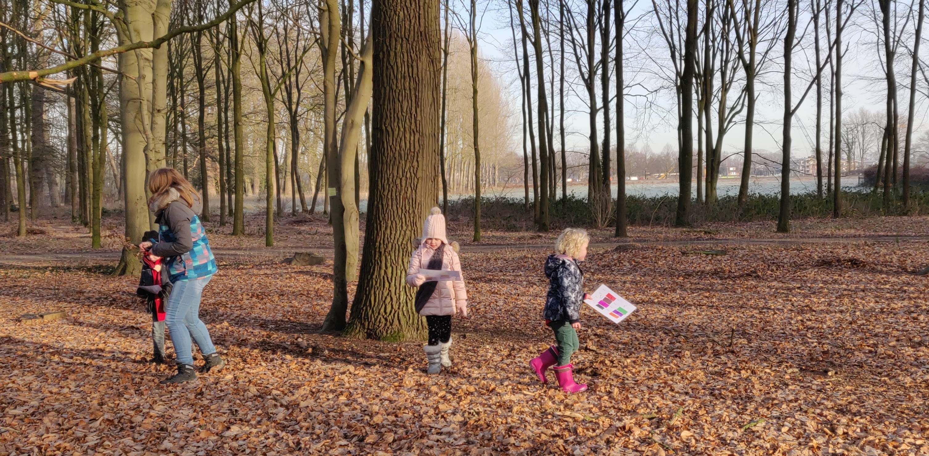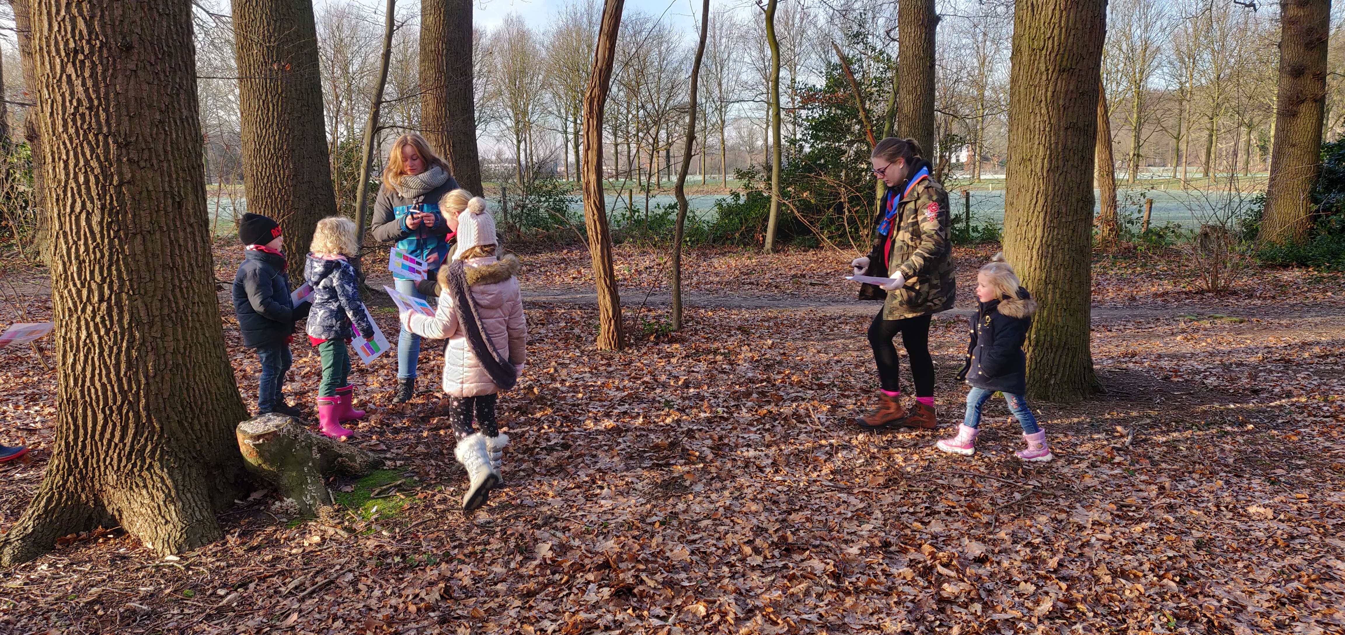 Het was vanmorgen een echte winteropkomst! Want het was heel koud. Het gras en de blaadjes waren wit van het ijs, maar de zon kwam er gelukkig wel lekker door. Beter dan zo'n vieze natte opkomst die we er al veel te veel hebben gehad. Dus begonnen we na het openen lekker met een bosspel. We deden kleurenbingo. Anne had in het bos overal kleurtjes op de bomen verstopt. En iedere Bever kreeg een bingo kaart. Dus wie als eerste zijn kaart vol had, had gewonnen! De kleuren kaartjes waren goed verstopt, waardoor het een leuke uitdaging was.