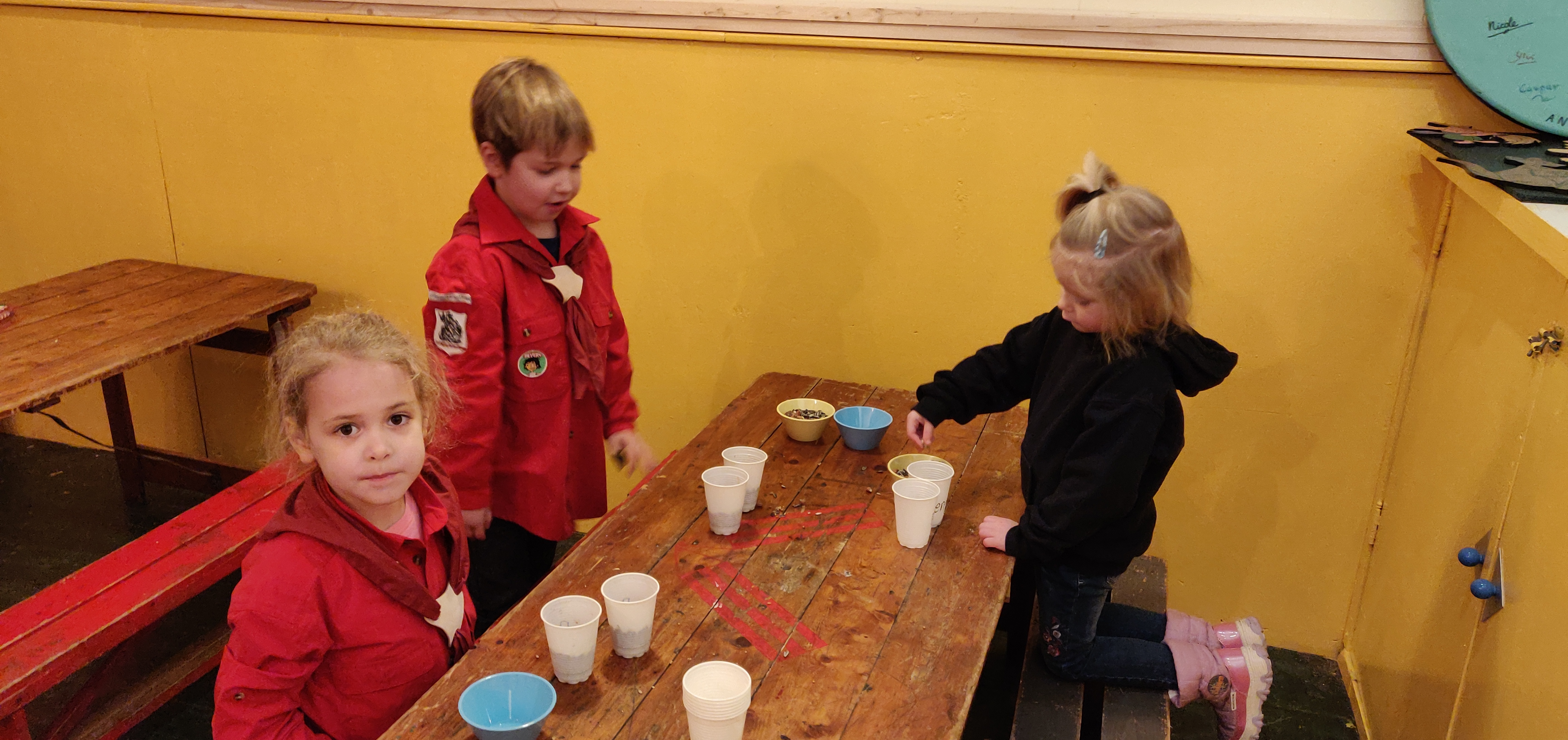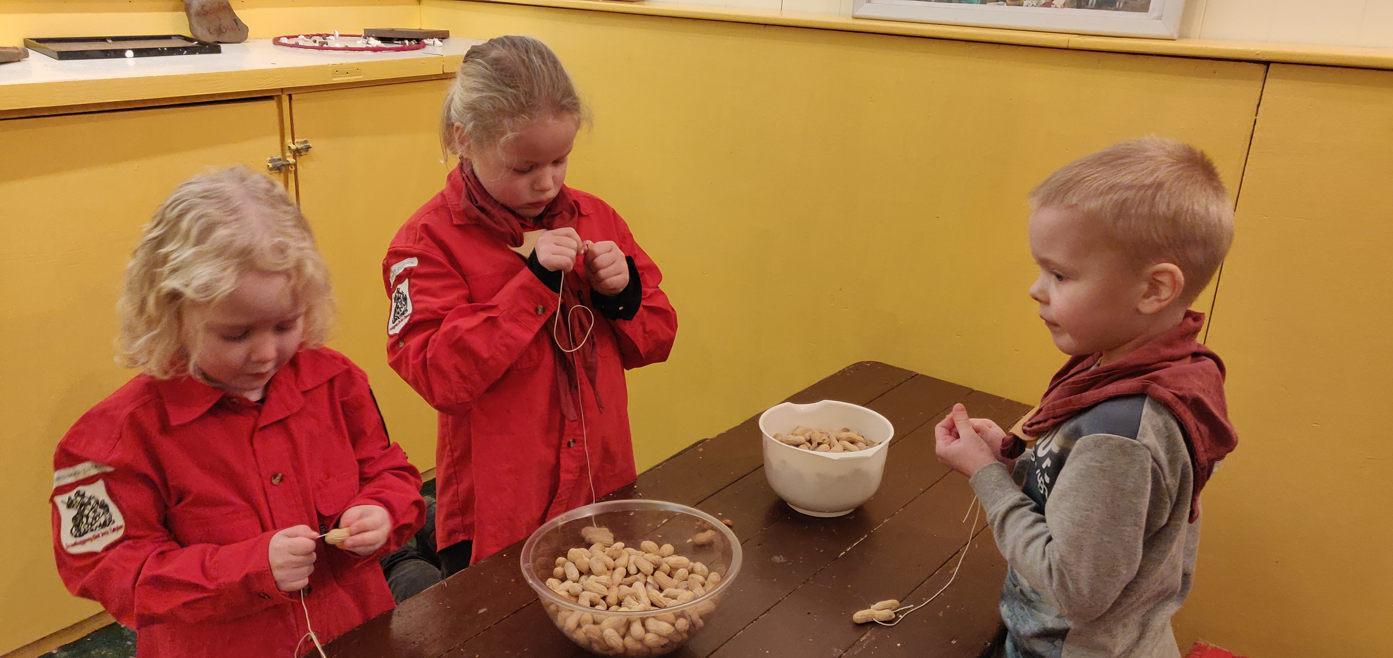 Toen we eenmaal een winnaar hadden, gingen we gauw naar binnen waar de kachel de blokhut lekker had opgewarmd. Daar ging Stuiter ons weer een verhaal voorlezen over Rebel en kregen we een bekertje limonade met een koekje. Toen dat verhaal was afgelopen, legde Anne ons het volgende onderdeel uit. We hebben pindakettingen en vetbolletjes gemaakt, voor de vogeltjes die de winter door moeten komen. De vetbolletjes moeten eerst nog stollen, dus die mogen volgende week mee worden genomen. Maar de pindakettingen zijn wel helemaal klaar om opgehangen te worden!