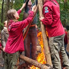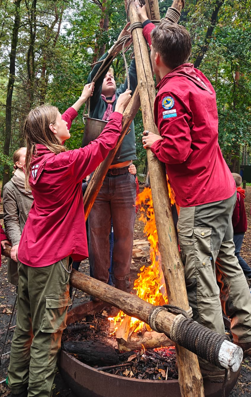 We begonnen met de officiële installatie, waarna het tijd was om de handen uit de mouwen te steken. De explorers lieten hun ouders zien hoe je een stevige driepoot pioniert, hout klooft en vuur maakt. Ondertussen waren de oudere explorers druk bezig met het snijden van de groenten, want al die nieuwe skills moesten natuurlijk meteen in de praktijk worden gebracht!