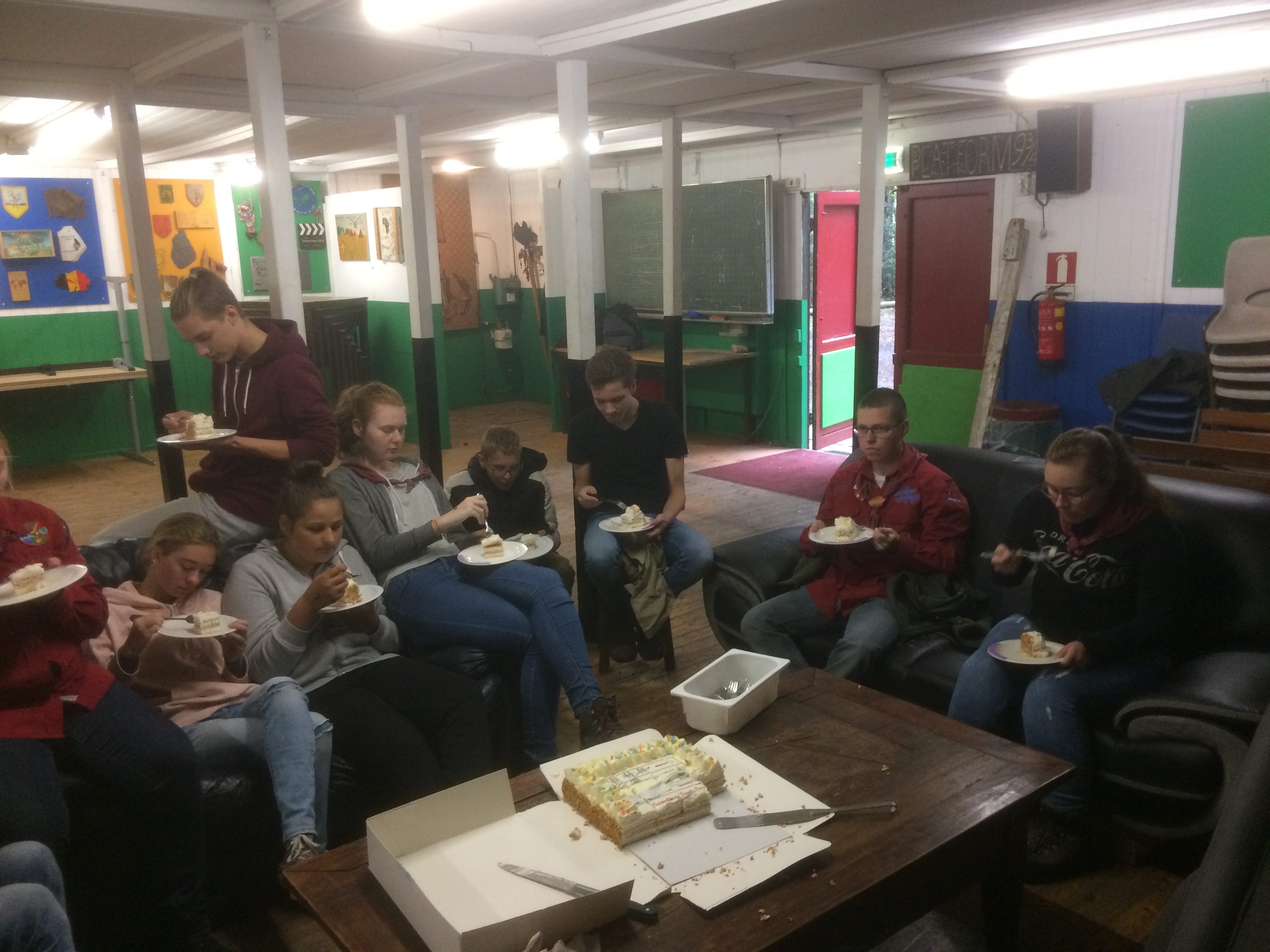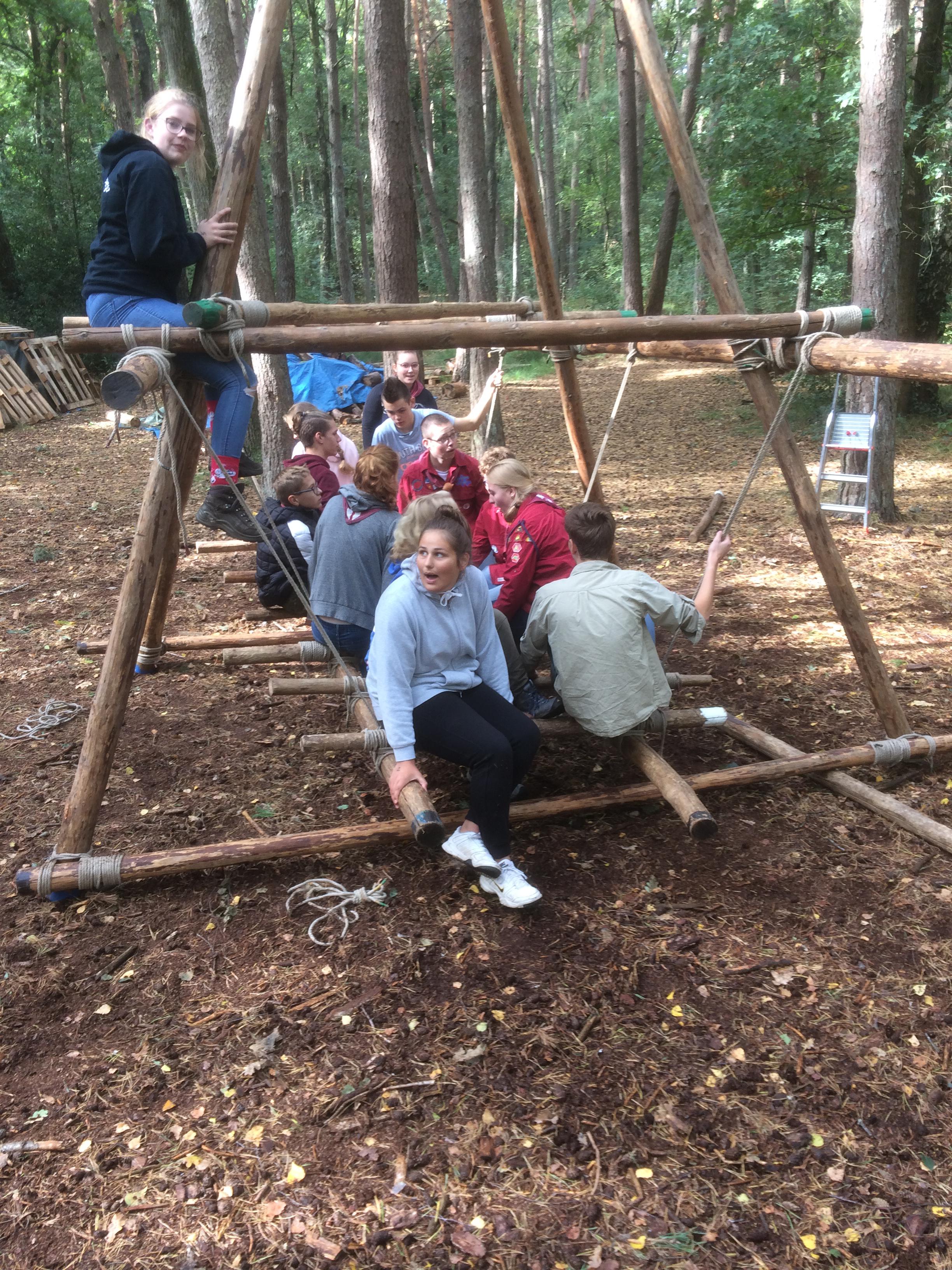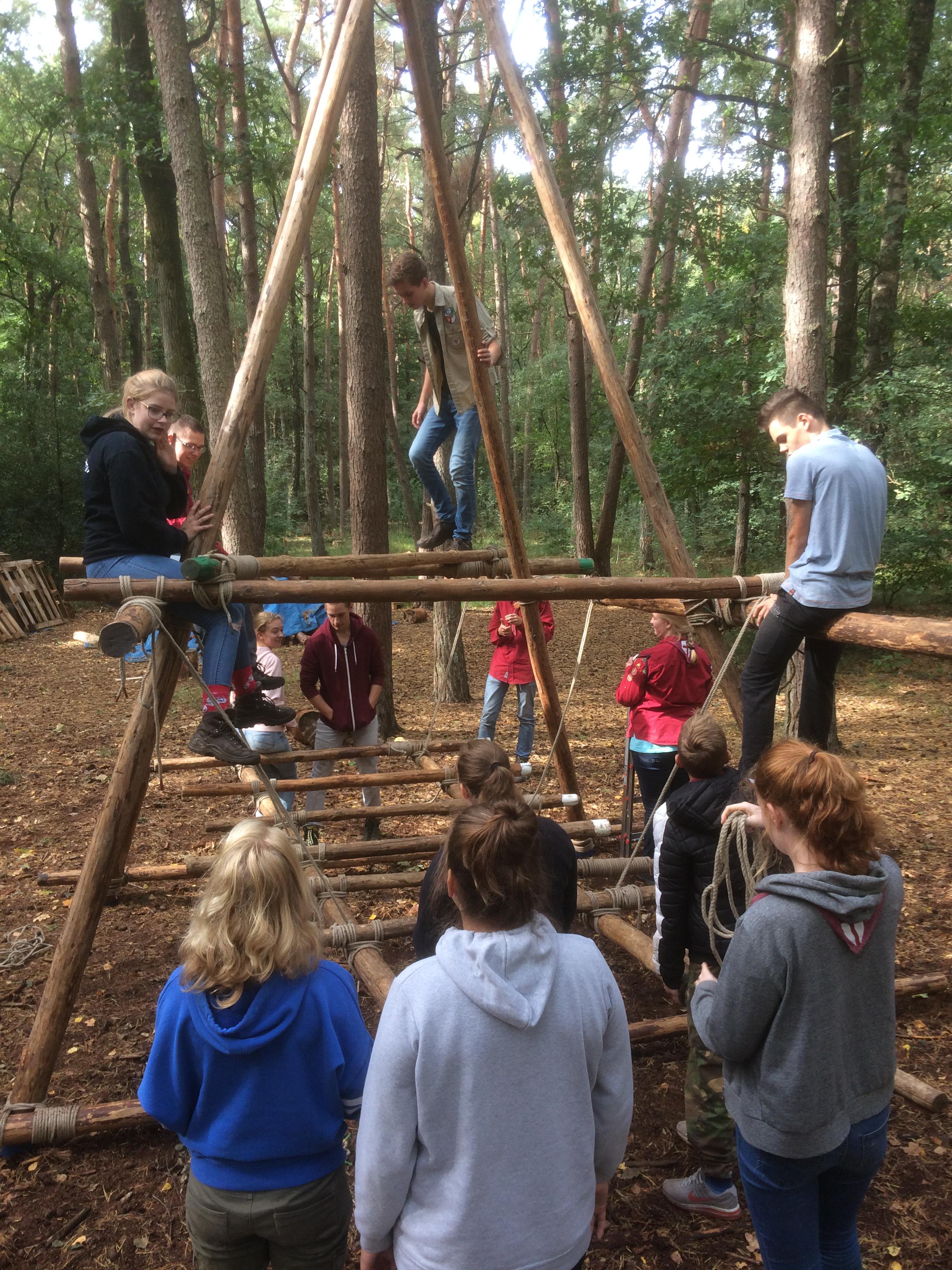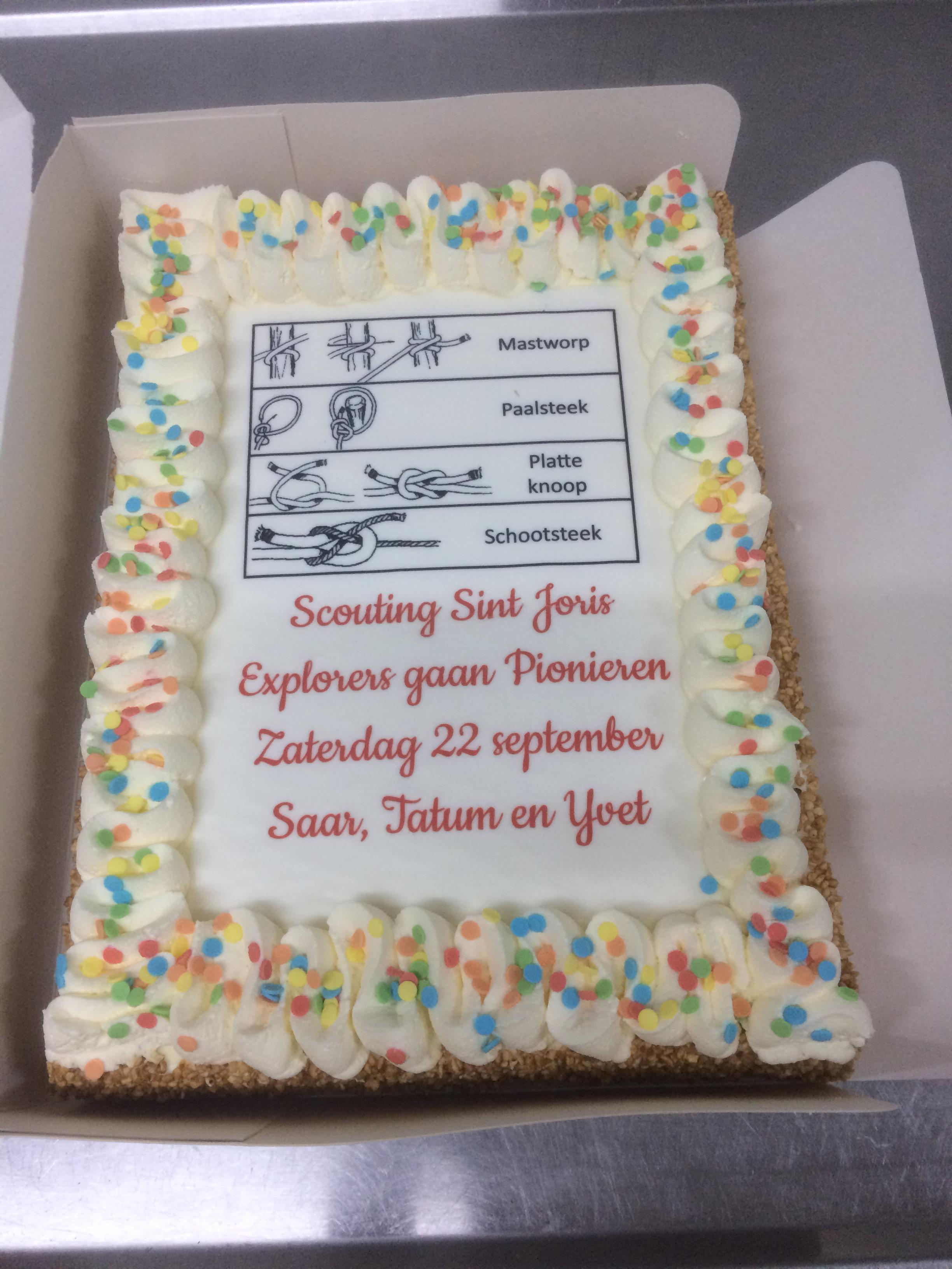 Vandaag de eerste Scouting activiteit van Saar, Tatum en Yvet. Het was een feestelijke opkomst. Volledig in thema was er een reusachtige taart (https://taartenbakkers.ah.nl) geregeld. Eerst het boodschappenspel van Yvet gespeeld. Na deze inspanning hadden we wel taart verdiend. Gezamenlijk werd daarna een familie schommel gepionierd. Mastworp, platte knoop, timmersteek, enkele schootsteek, 8-vormige-, kruis- en diagonaal sjorring werden in de object verwerkt. Lotte als nieuwe voorzitter heeft daarna nog de opkomst geëvalueerd. Volgende week deel 2 van Pionieren.....