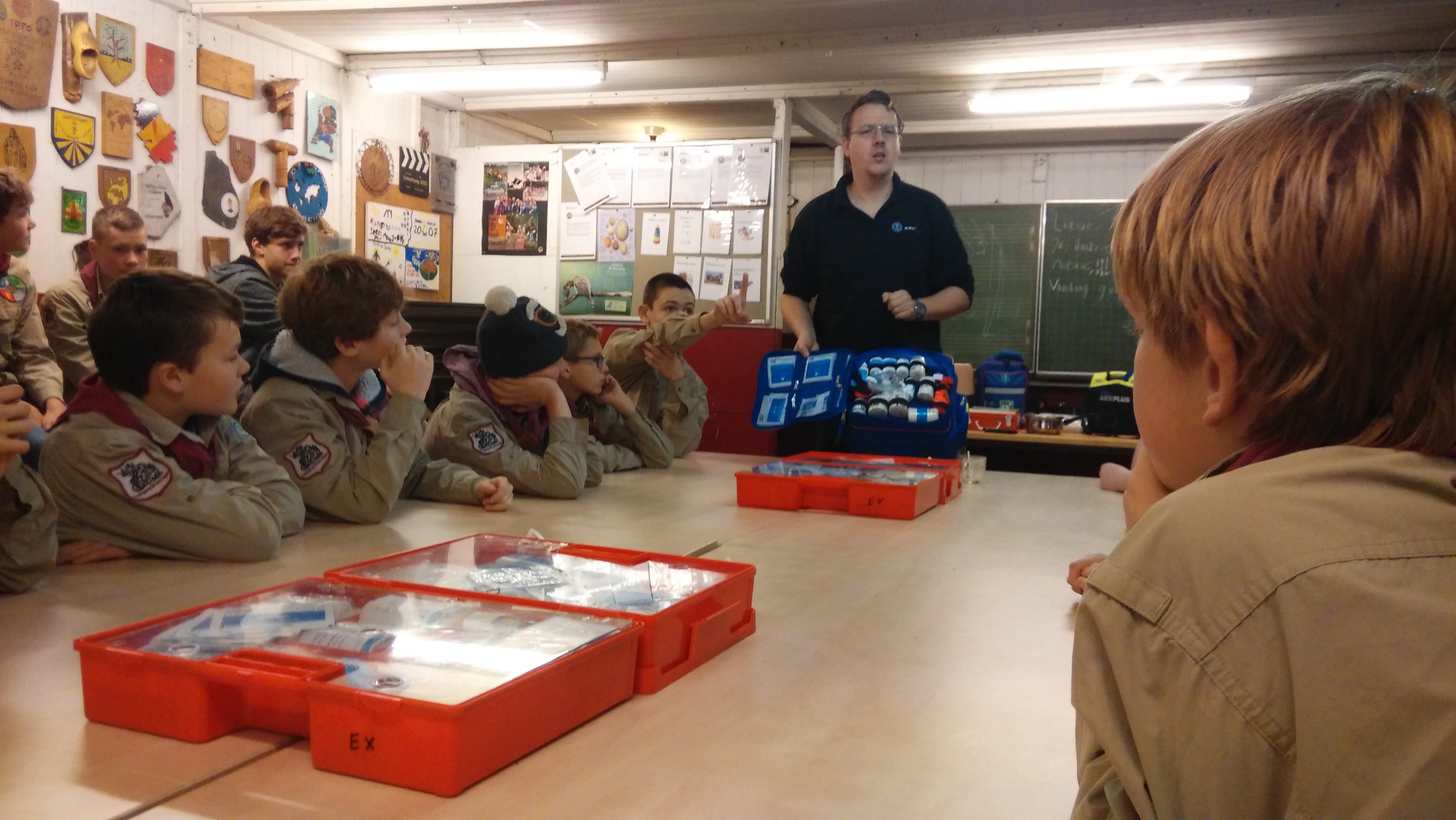 Een andere bijzondere opkomst vond afgelopen zaterdag plaats. Deze opkomst stond volledig in het teken van EHBO. Tijdens deze opkomst kregen de scouts uitleg van een extern persoon van M.M.S.T. Dit bedrijf is actief in het geven van cursussen en trainingen binnen de eerste hulp. De scouts hebben onder andere een snelverband bij elkaar aangelegd, kennis gemaakt met een AED en instructies gekregen over bellen met 112.