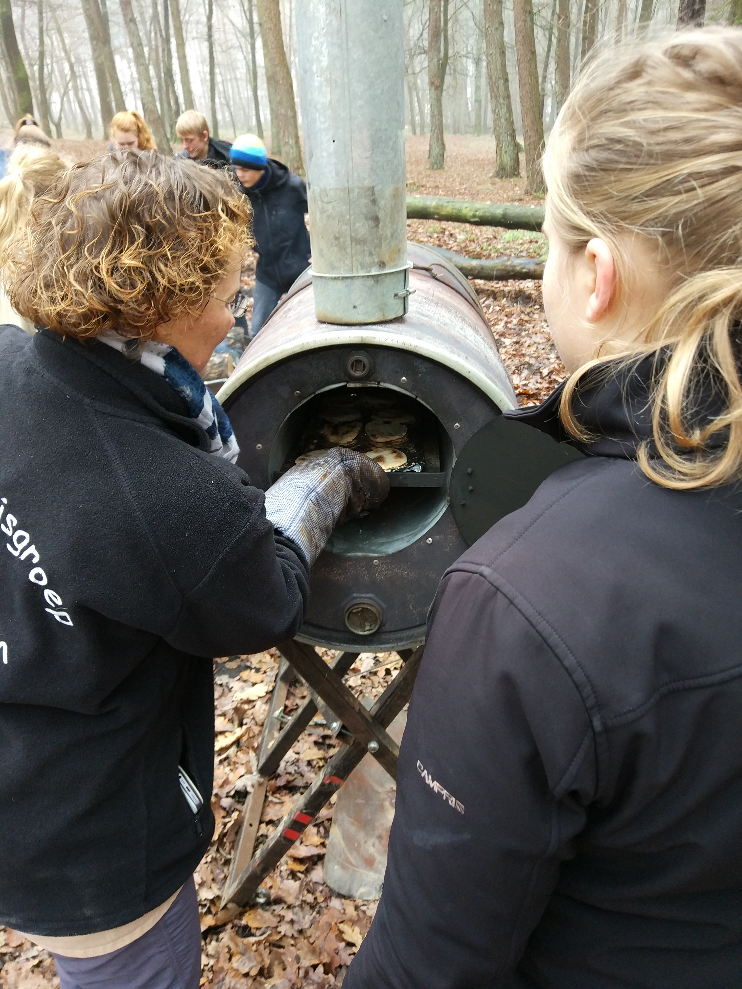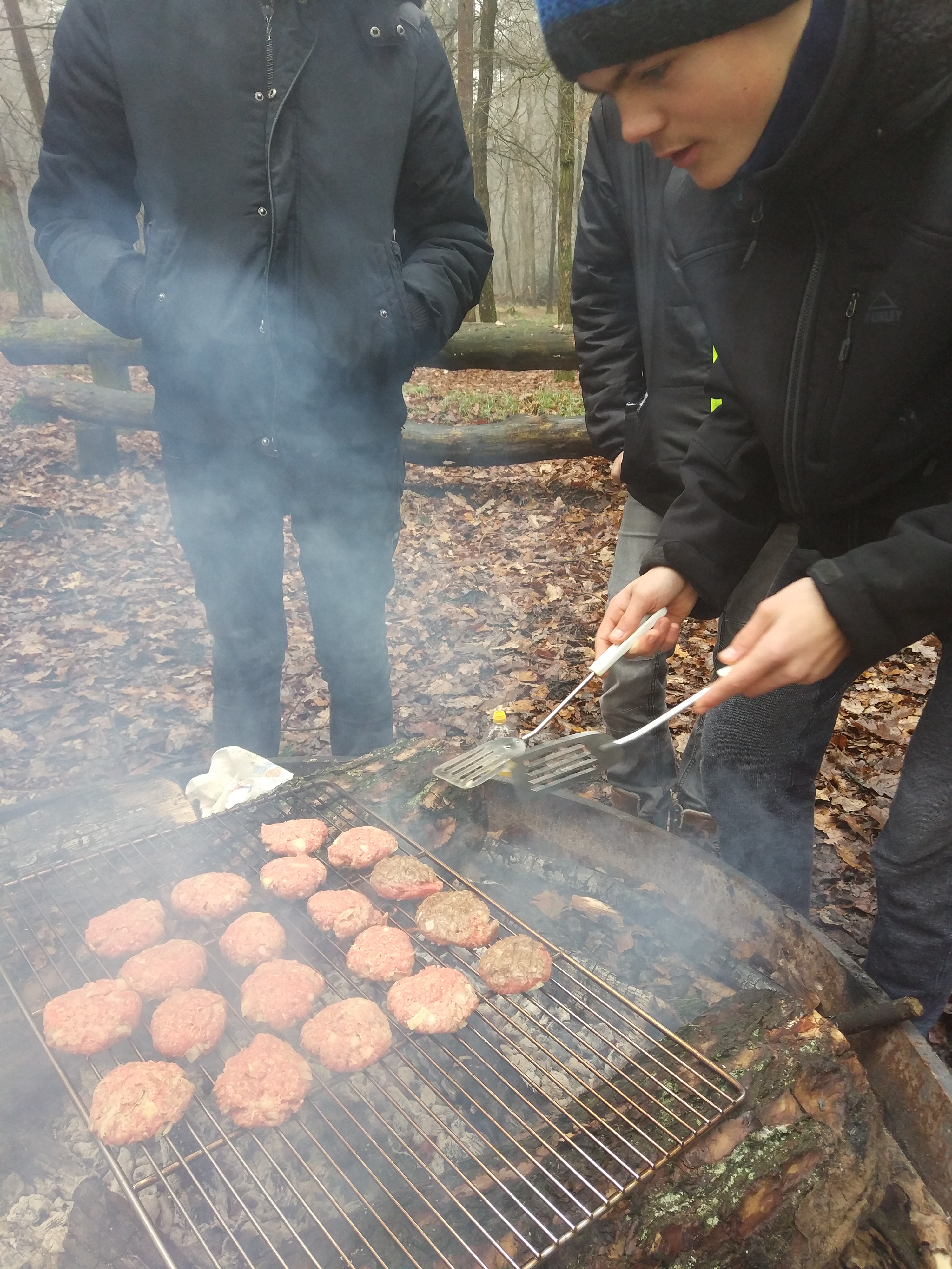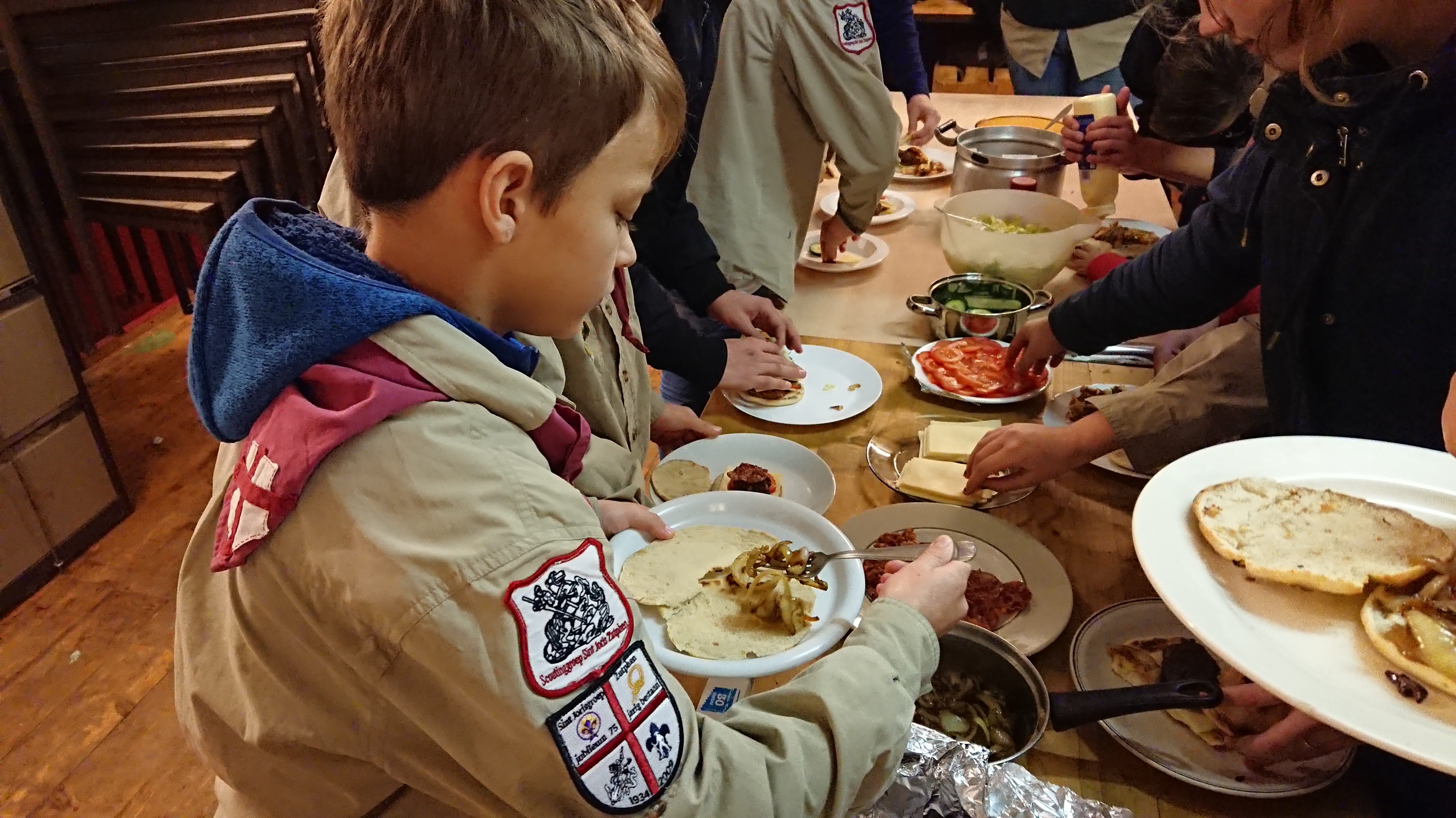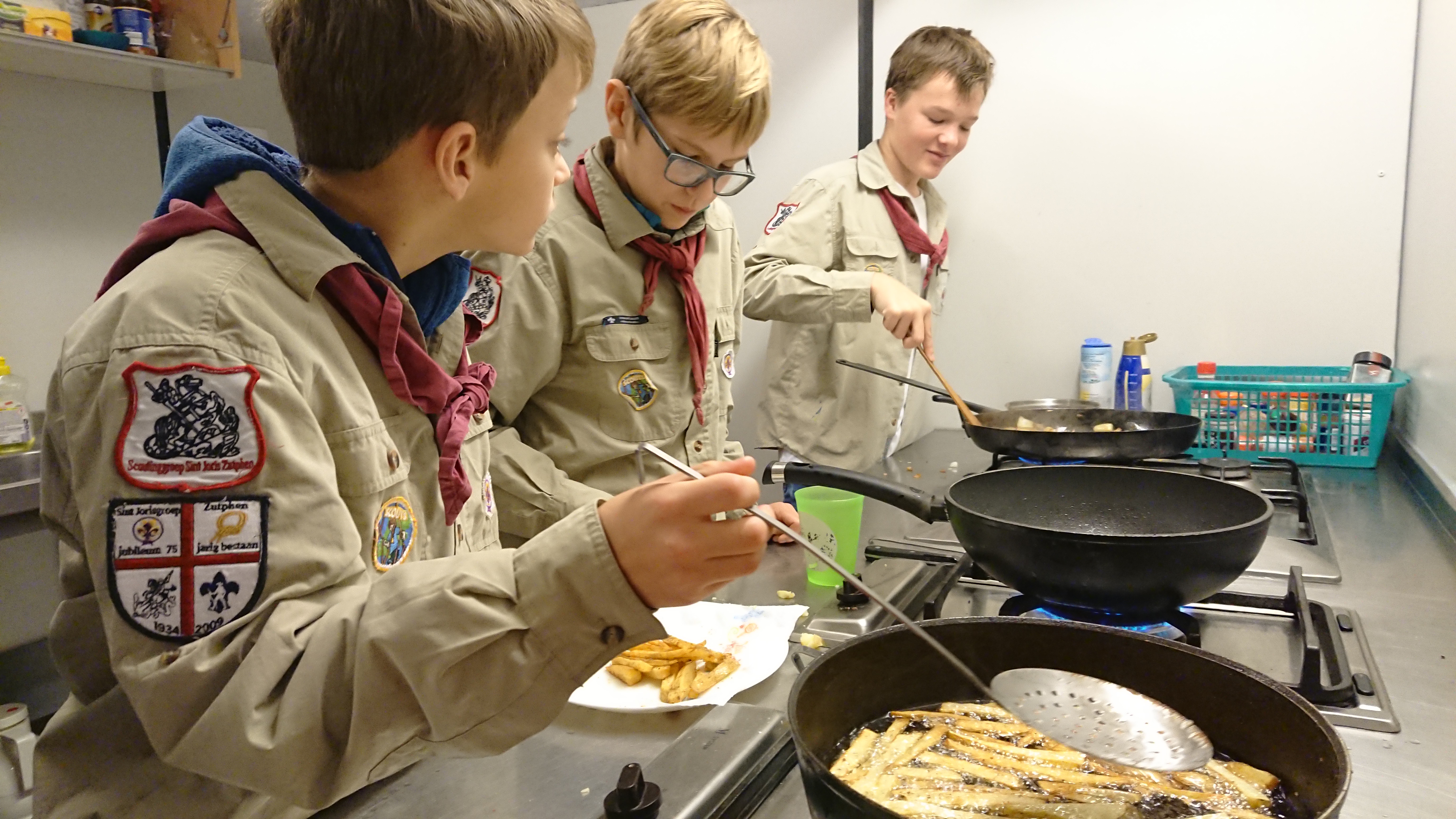 De eerste patrouille moest zorgen voor hamburgers. Uiteraard waren er geen kant-en-klare hamburgers gekocht, maar moesten ze zelf het gehakt kruiden en omvormen tot een hamburger. Daarna was het een kwestie van de hamburgers goed bakken op een rooster boven een houtvuurtje in de kampvuurkuil. De tweede patrouille had de taak om pitabroodjes te maken. Buiten werd door de leiding de houtoven flink opgestookt, terwijl de scouts ondertussen het deeg klaarmaakte. Toen de oven eenmaal warm genoeg was en het deeg genoeg was gerezen, konden de broodjes de oven in. Deze patrouille had ook nog tijd om allerlei ingrediënten voor op het broodje te snijden, zoals komkommer, sla en tomaat. De derde en laatste patrouille heeft gezorgd voor heerlijke frietjes en 'aardappelsnacks'. Ze hebben de aardappels even gekookt en in mooie reepjes gesneden, om ze vervolgens te frituren in een pan.