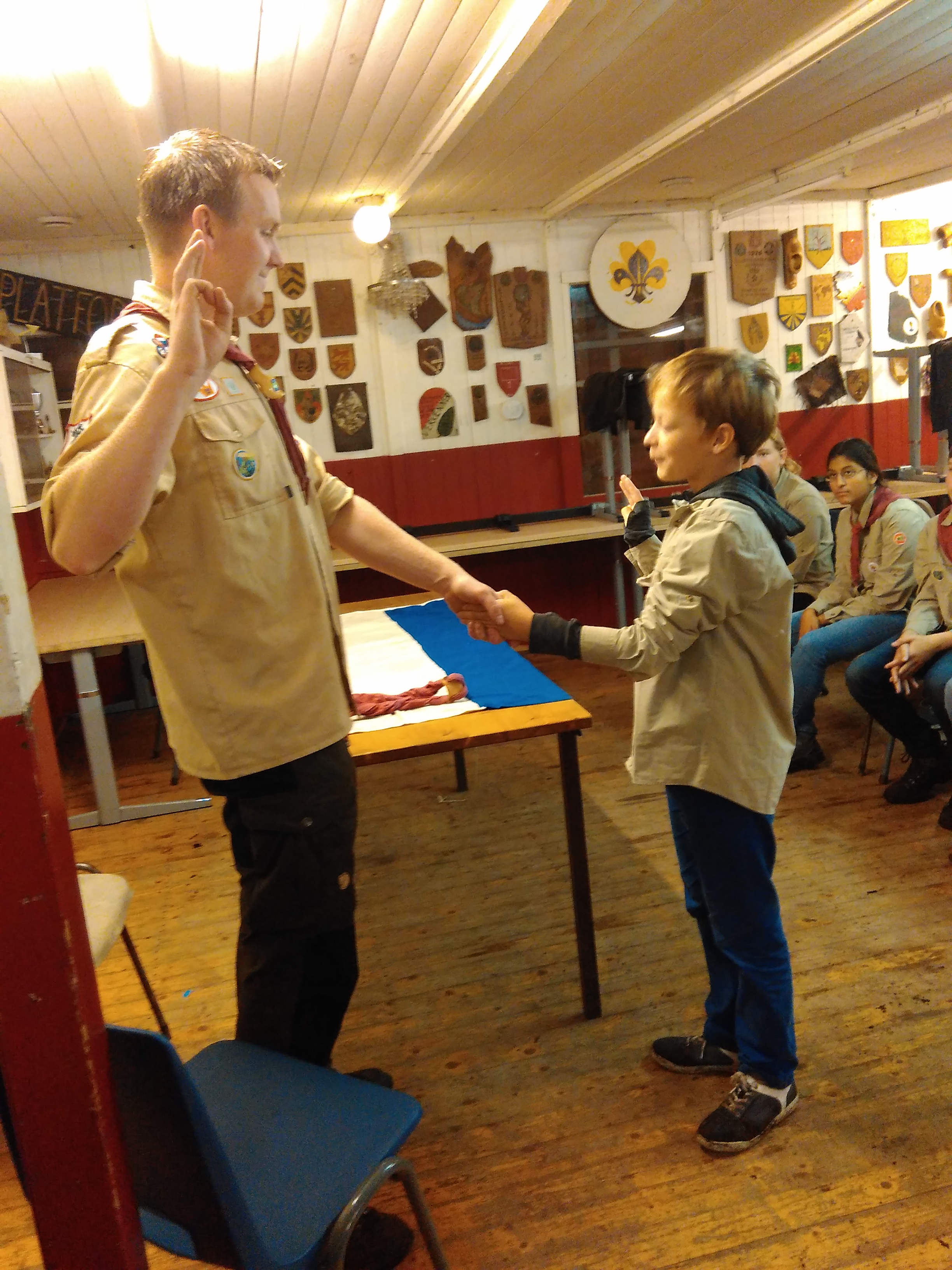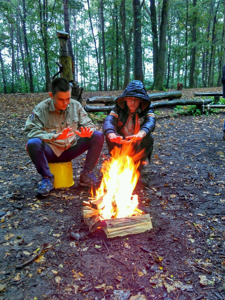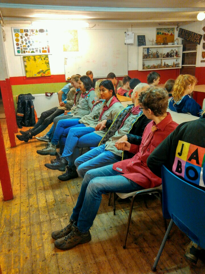 Op zaterdag 30 september was de tweede opkomst voor de scouts die in het teken stond van het behalen van het insigne ‘houtbewerking en stoken’. Vorige week stond de opkomst volledig in het teken van hakken en deze zaterdag zou er aandacht besteed worden aan verschillende soorten vuren. Na de opening werden er direct twee- of drietallen gemaakt en werd er druk begonnen met het kloven van wat droog hout. De meeste scouts moesten met hun groepje een tipivuur maken en een paar scouts een pagodevuur. Tijdens het kloven begon het steeds harder te regenen, maar de scouts gingen stug door met hakken! Op een gegeven moment was er echter geen houden meer aan en zijn we de blokhut in gegaan. In een periode met wat minder harde regenen hebben de scouts met z’n allen toch nog twee mooie vuurtjes gemaakt, maar het echte programma was al letterlijk en figuurlijk in het water gevallen. Als alternatief programma hebben de scouts o.l.v. de RSA in de blokhut het ‘stiftenspel’ gespeeld. Rond 12 uur werd de regen weer wat minder en werden er nog snel wat marshmallows boven het bijna uitgeregende vuur gemaakt. Om 12.20 uur was het tijd voor de installatie van Wout! Hij is nu eindelijk van zijn groene blouse af en mag ook een mooie beige blouse aan. Nadat hij nog even door alle scouts naar het voetbalveld heen en weer werd gedragen, was het tijd voor de sluiting. Volgende week staan het theorie- en praktijkexamen voor het insigne op het programma! Spannend!