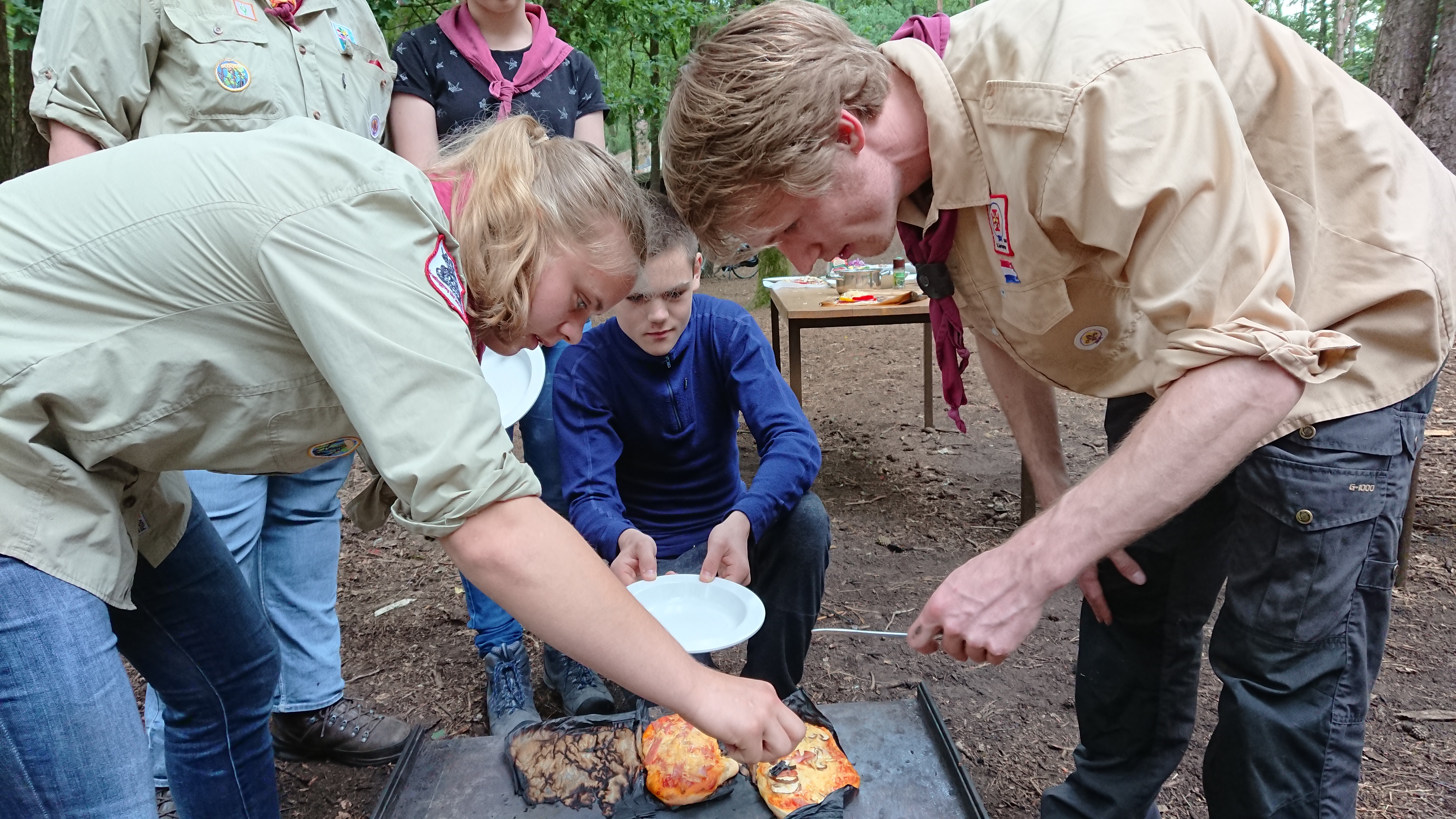 Owwww ja! zaterdag was het zo ver, pizza's bakken! Dit moet je lezen als: de leiding heeft er ook zeker zin in! ;). Vlak na de opening is het moment dat de leiding uit de doeken doet wat het programma is. En bij het vallen van de woorden 'we gaan pizza's bakken', viel er toch de nodige expressies in de trant van "ik probeer het niet te laten blijken"; nodige voorzichtige, soms half ingeslikte YESSSSS 'jes. De taken zonder enige probleem verdeeld; houten hakken voor het opstoken van de oven, het bereiden van het deeg en het snijden van de groenten. De tafels worden klaar gezet en stuk voor stuk worden de pizzabodems uitgevouwen en belegd. Met de vlam in de pijp gingen de pizza's de oven in en kwamen er heerlijk gebakken uit, kortom een geslaagde opkomst!