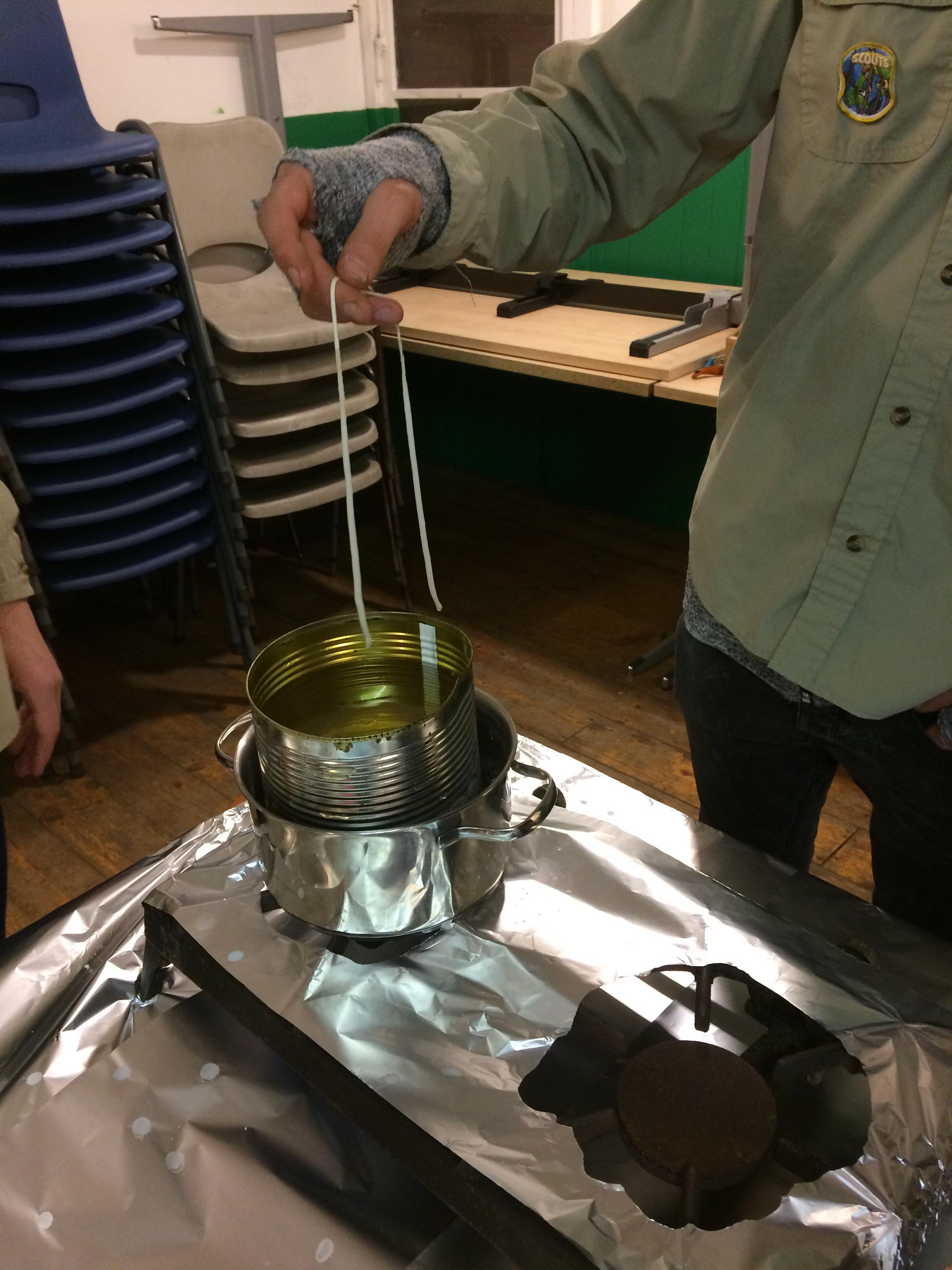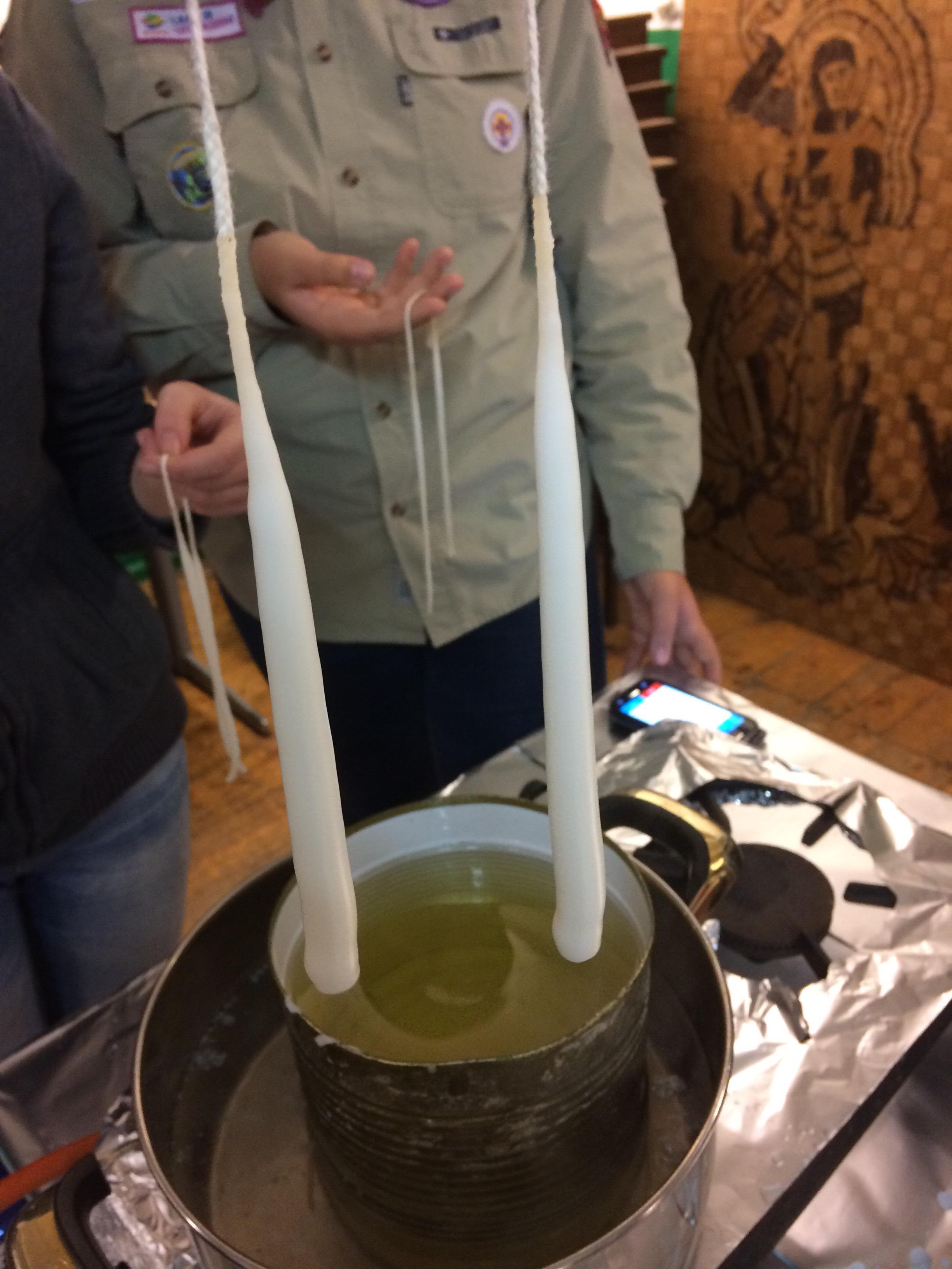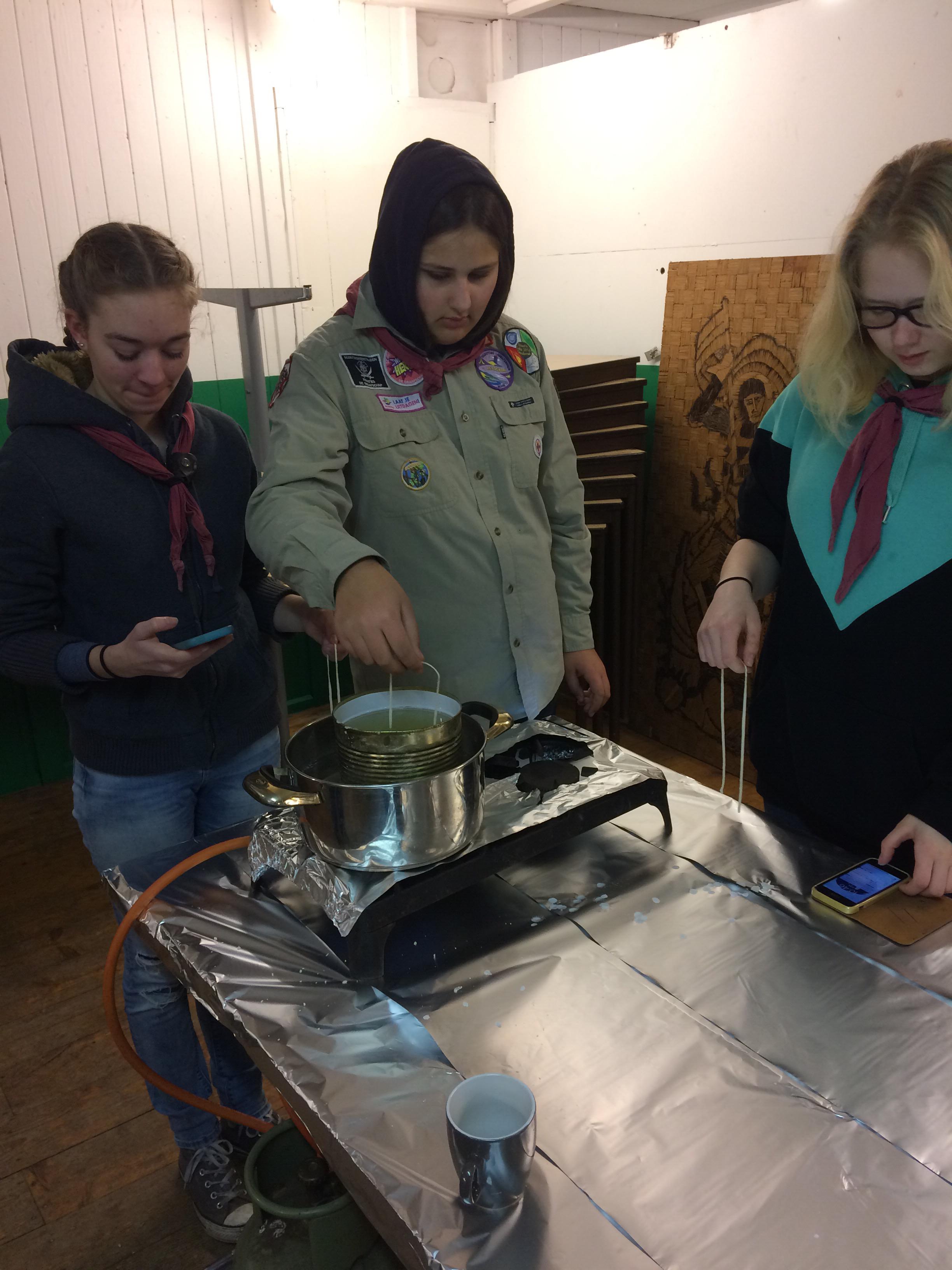 Gisteren stond er een vette opkomst op het programma, een kaarsvette opkomst wel te verstaan. De leiding had natuurlijk gewoon elke scout een gekochte kaars kunnen geven, maar dat vonden ze iets te makkelijk. Dus ze besloten om die gekochte kaarsen eerst in stukken te hakken, te smelten en vervolgens de scouts zelf kaarsen te laten maken. Dit deden ze door een lont steeds in het kaarsenvet onder te dompelen. Bij de scouts werd vooral het geduld op de proef gesteld, aangezien ze na elke dompeling in het kaarsenvet een halve minuut moesten wachten. Gelukkig was de leiding voorbereid op de soms wat ongeduldige scouts en hadden ze een aantal 'black stories' (raadsels) meegenomen om de hersens van de scouts in de tussentijd te laten kraken. Na heel wat dompelingen ontstonden er zo mooie kaarsen. Sommige scouts besloten zelfs nog een leuk vormpje aan de kaars te geven door ze bijvoorbeeld in elkaar te draaien. Al met al een vet geslaagde opkomst!