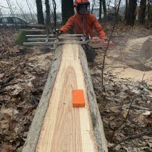 Het hout wordt geselecteerd voor planken, brandhout of terug in de natuur. Zelf planken zagen van een Amerikaanse eik is Niels zijn specialiteit.