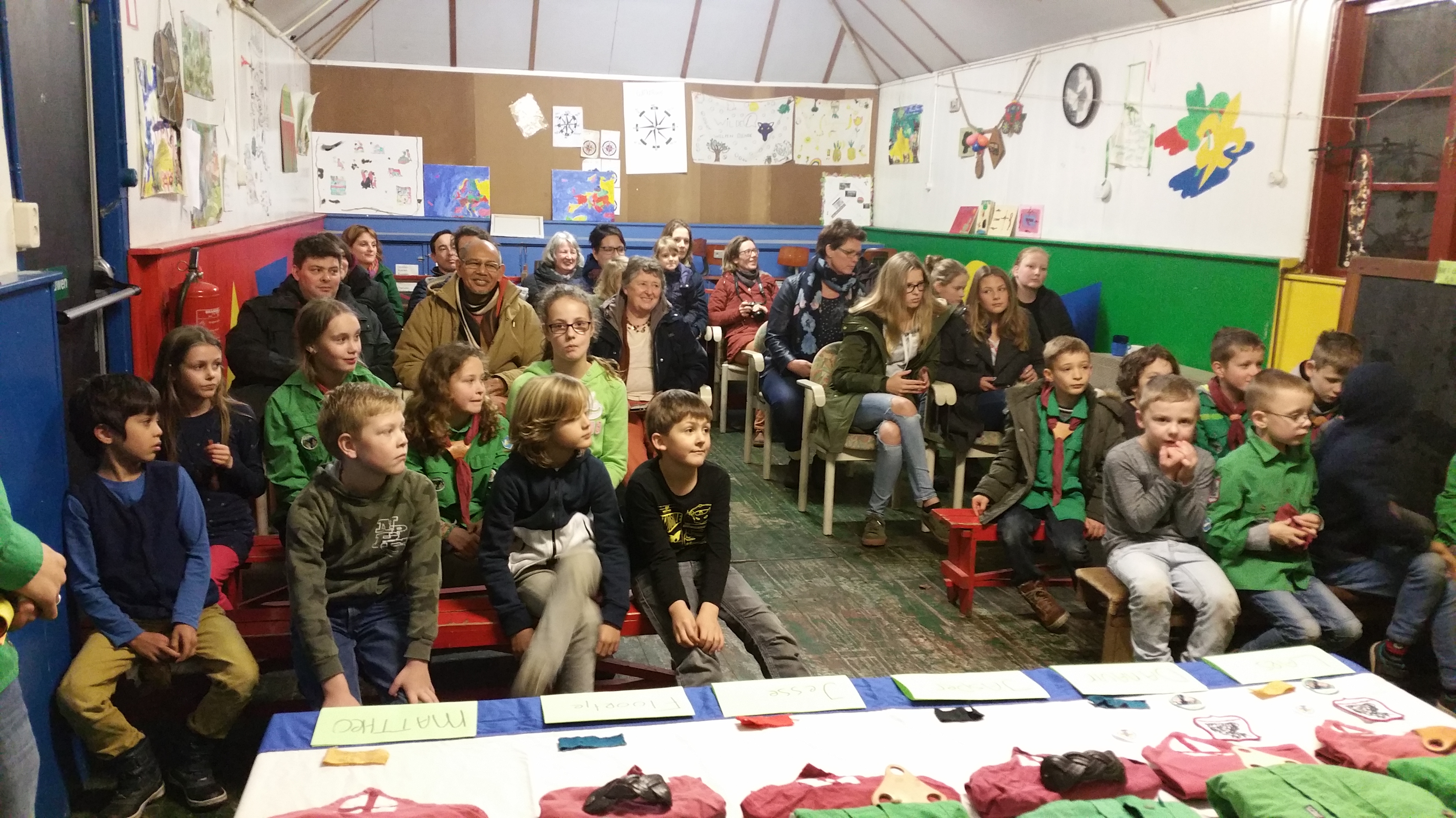 Toen iedereen klaar was en alle ouders en ander bezoek er waren konden we beginnen met het installeren. Dit begon zoals altijd met het uitleggen van de verschillende insignes en over wat installeren inhoudt. Daarna gingen we door met de quiz. Natuurlijk deden ze het allemaal super goed en konden we door naar het echte installeren. Eerst kregen de welpen hun uniform aan en kregen ze hun das om. Daarna mochten ze één van de leiding de linker hand geven en de belofte opzeggen: