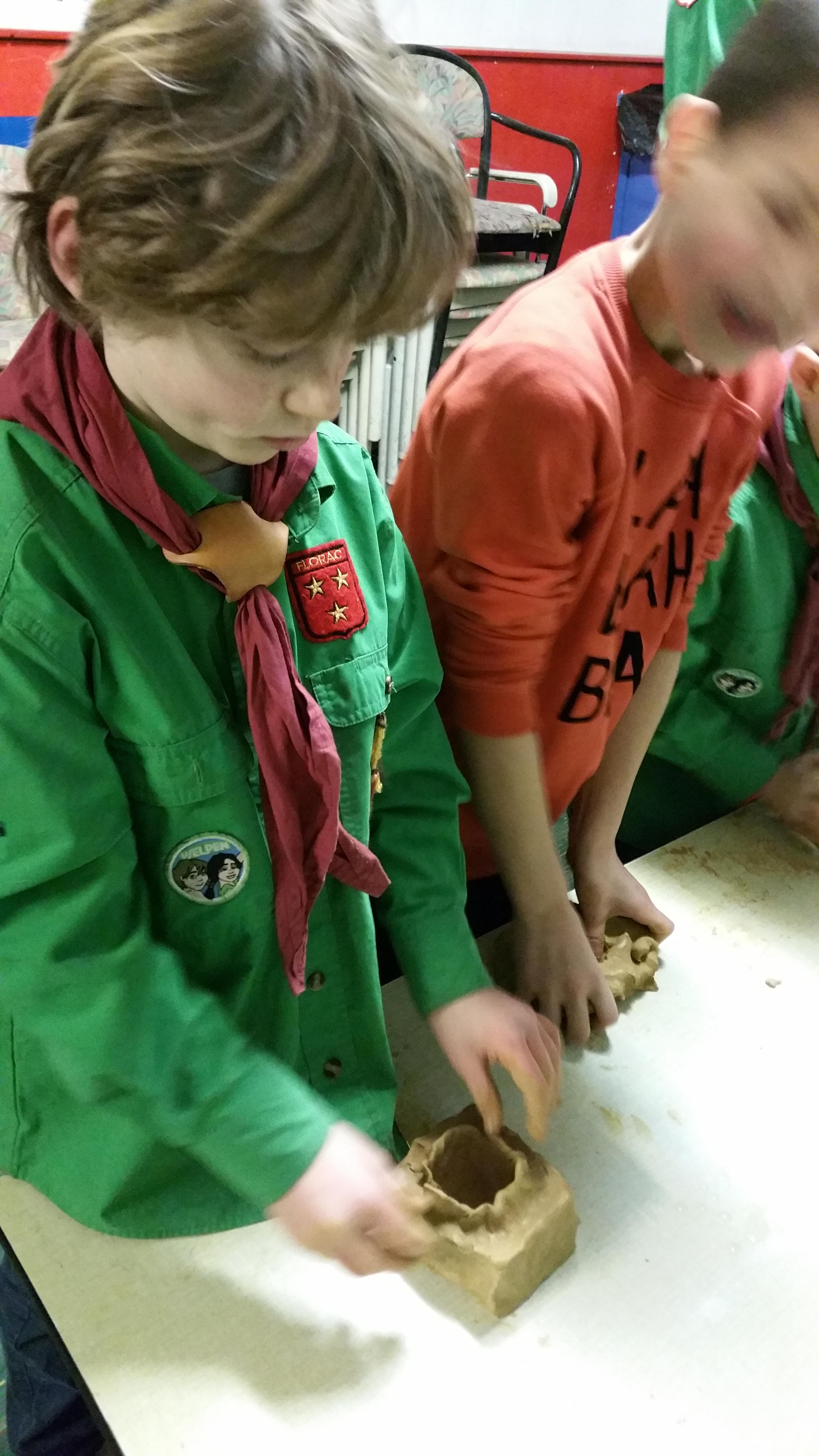 Zaterdag 27 januari zijn we natuurlijk ook begonnen met openen. Na de opening zijn alle welpen naar het bos gegaan om het spel beeldenmuseum te doen. Toen iedereen weer binnen was probeerde iedereen er achter te komen wat we nou gingen doen... We gaan potten (of iets anders van klei ;)) bakken! Na de uitleg van Cilia kregen alle welpen een stuk klei om iets van te maken. Er zijn van allerlei mooie creaties gemaakt! De welpen die klaar waren mochten in het bos gaan spelen. Wat nu erg leuk is met de omgevallen bomen. Er ligt nu ook veel water, dus hebben de welpen ook een brug gemaakt!
