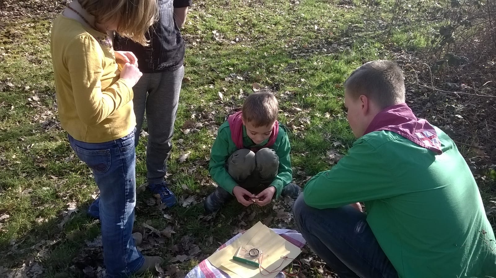 Als laatste werden de welpen verdeeld over vijf groepen. Iedere groep kreeg pen, papier, een kompas en een theedoek. Het was de opdracht om de theedoek te verstoppen op een plek, en een piraten-schatkaart te maken naar de theedoek toe. Iedereen is daar supergoed mee aan de slag geweest, en we hebben de meeste theedoeken nog teruggevonden ook!
