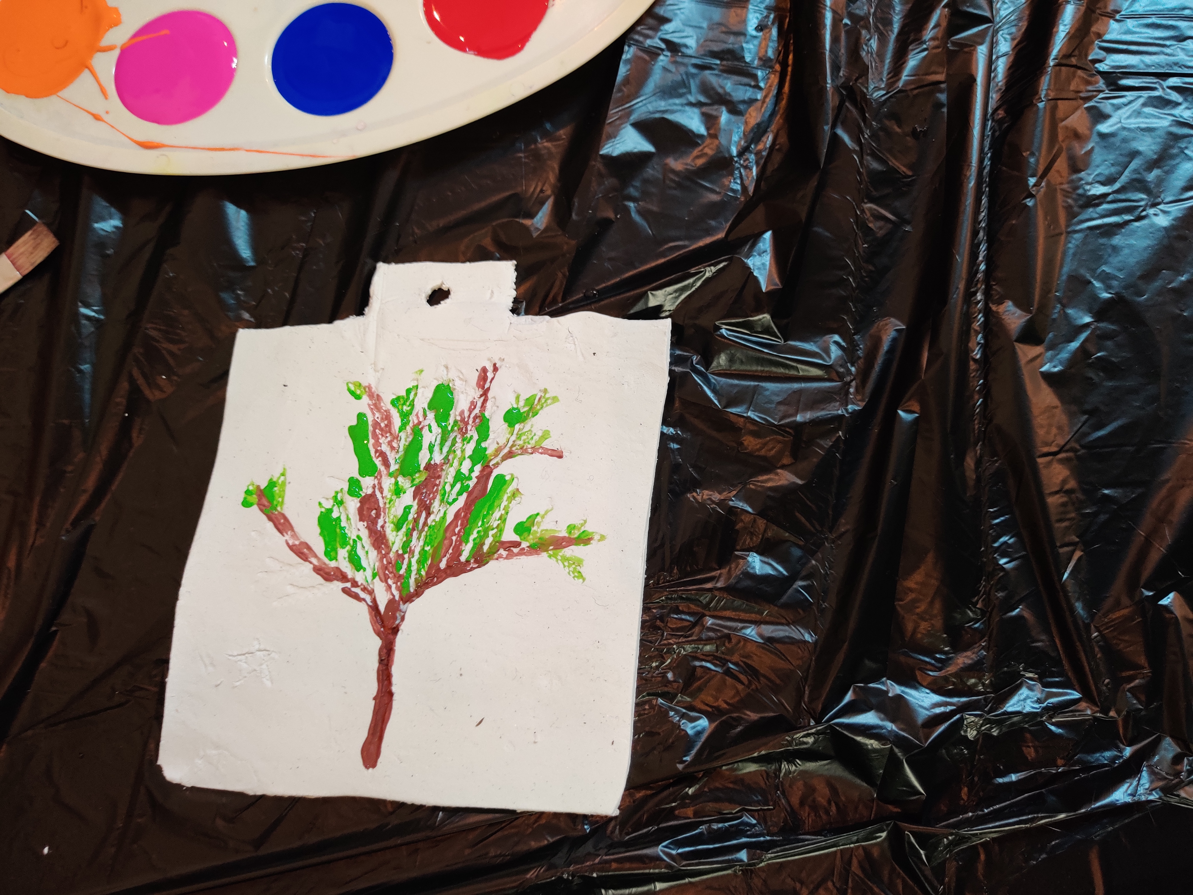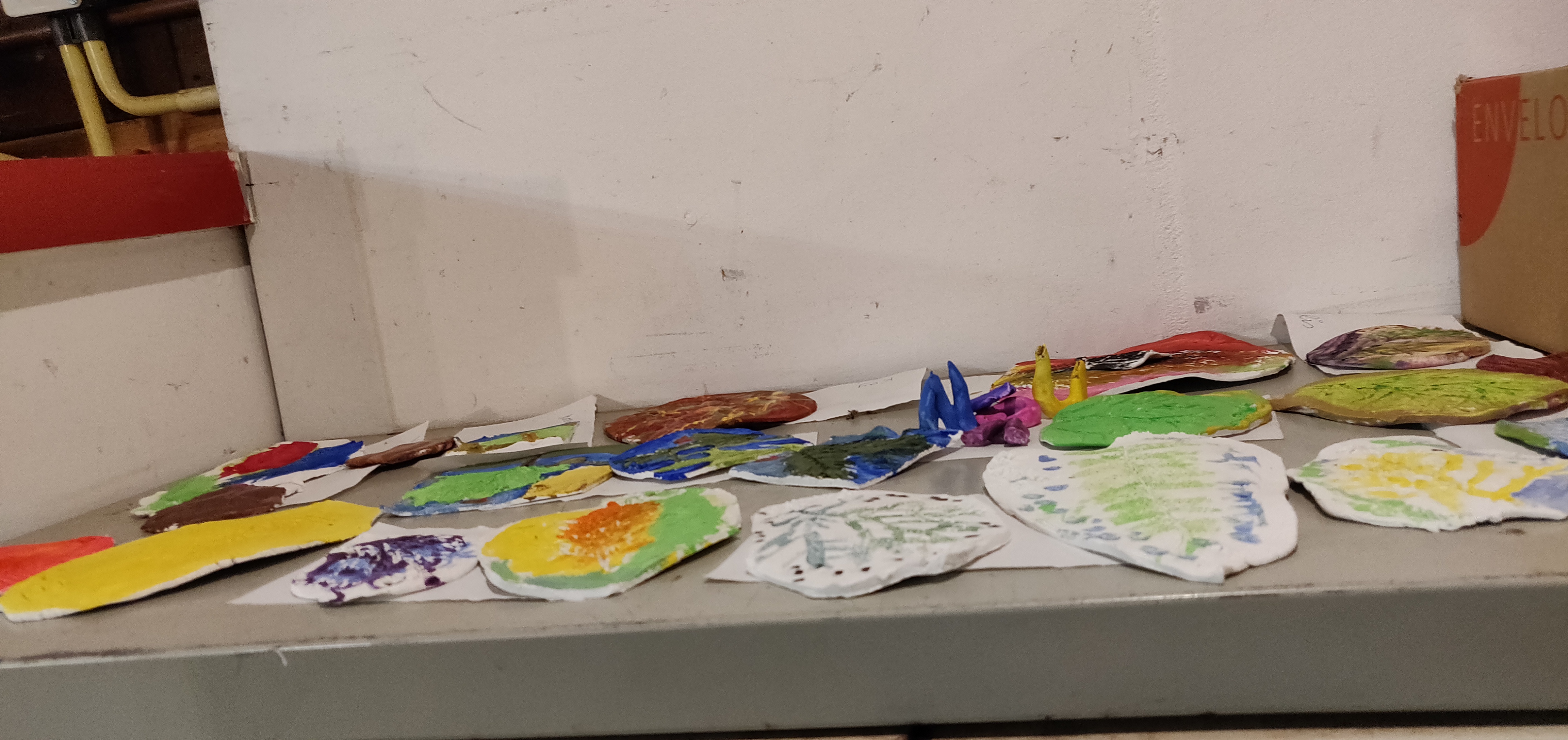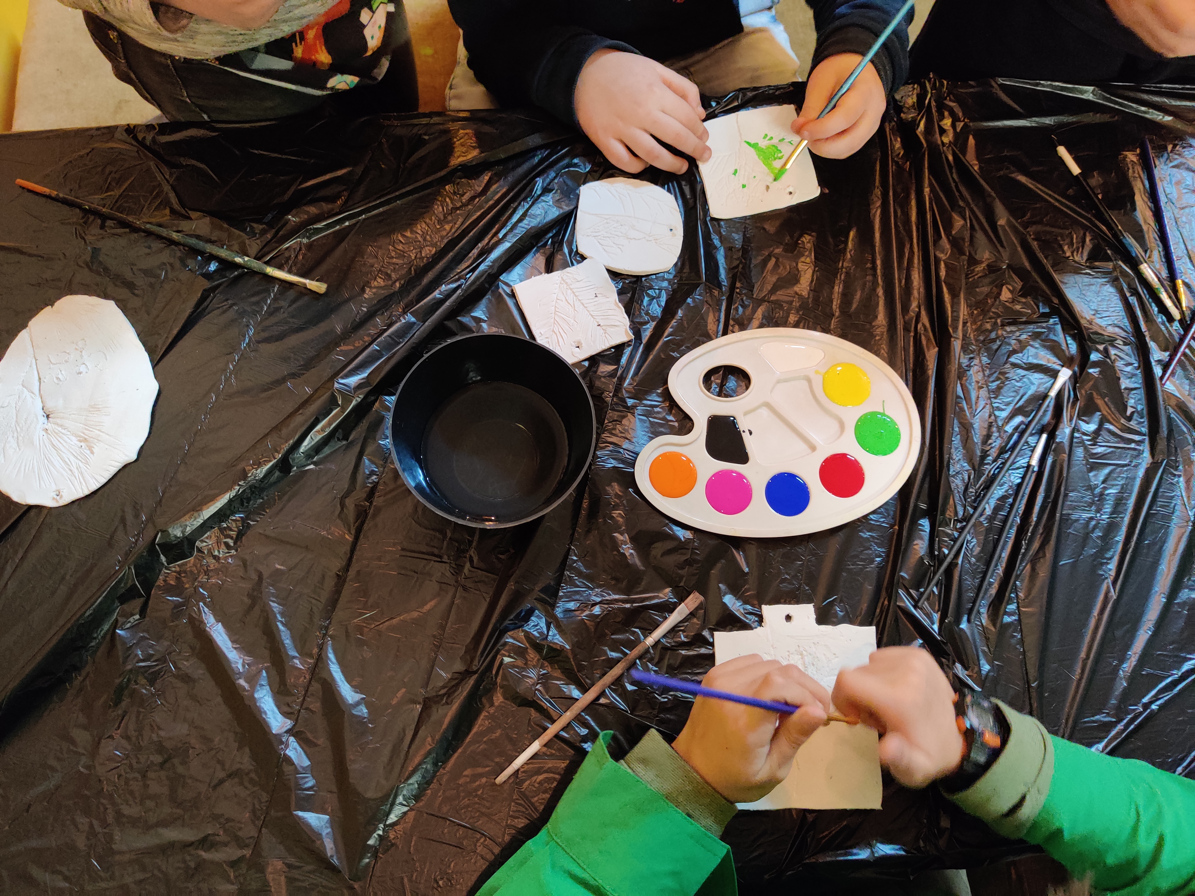 Vervolgens kwamen de kunstwerkjes van vorige week weer tevoorschijn. De inmiddels gedroogde stukken klei waarin afdrukken van takken en bladeren waren gemaakt (plus nog enkele eigen projectjes), werden deze week mooi beschilderd en liggen nu weer te drogen op de kasten in de blokhut.