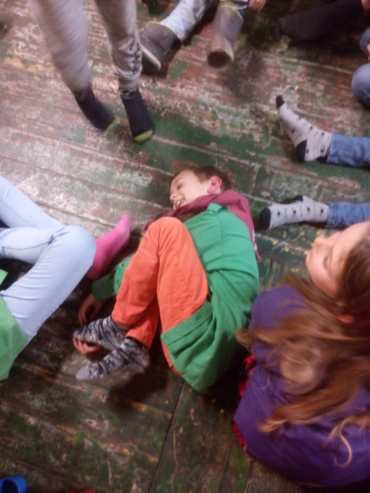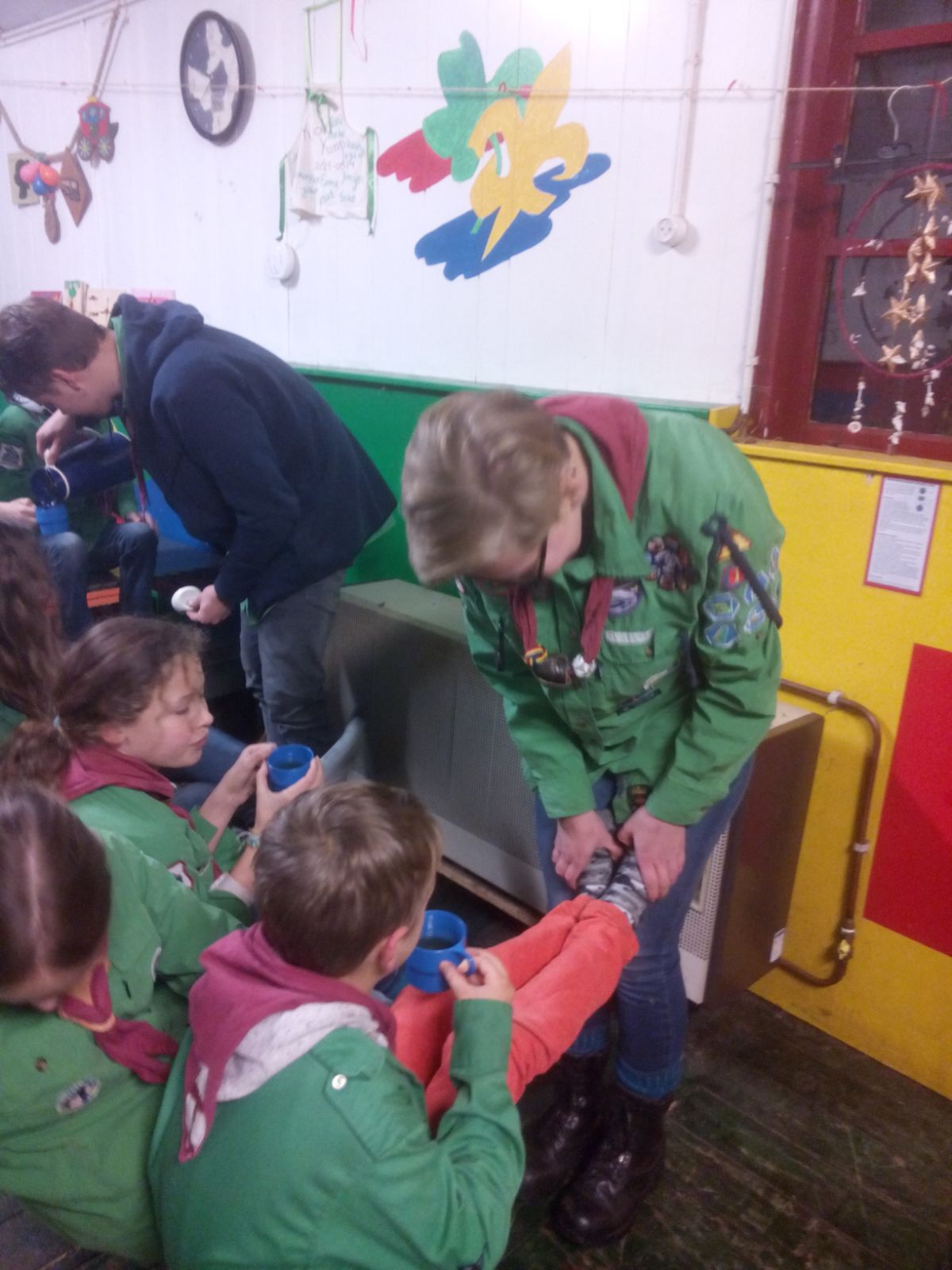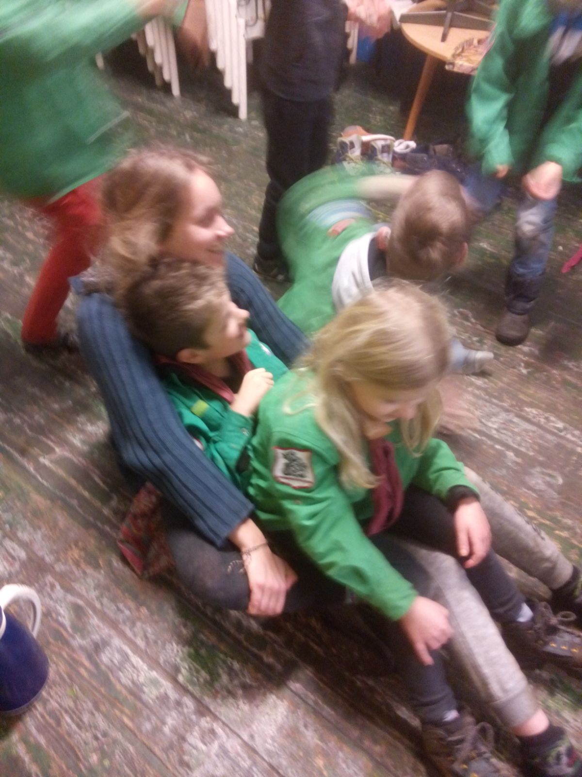 Sommige voeten waren wel heel koud, dus die moesten even gemasseerd worden bij de kachel. Na de thee gingen we verder met het programma, namelijk moordenaartje. Eén welp, de politieagent, moest in het andere lokaal wachten tot er een moordenaar was aangewezen. Terwijl de moordenaar burgers vermoorde met een knipoog, moest de agent er achter komen wie de beruchte moordenaar was.