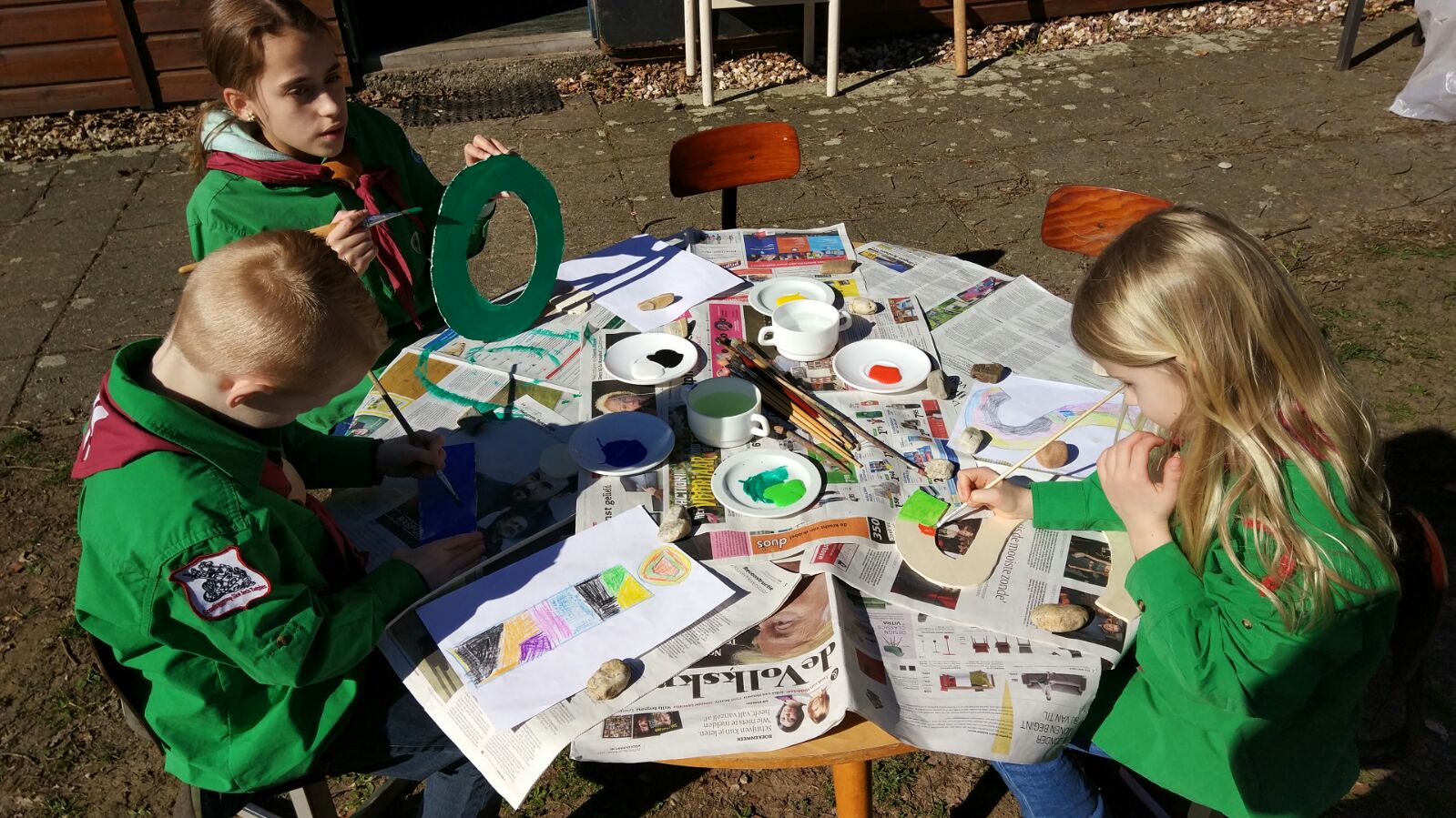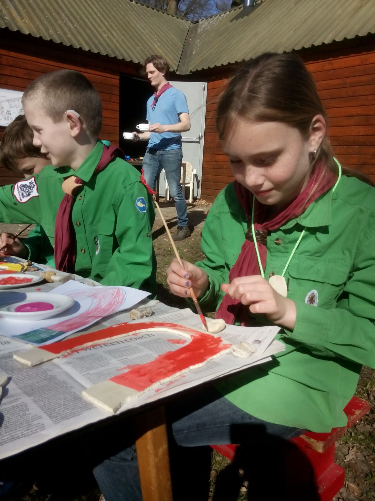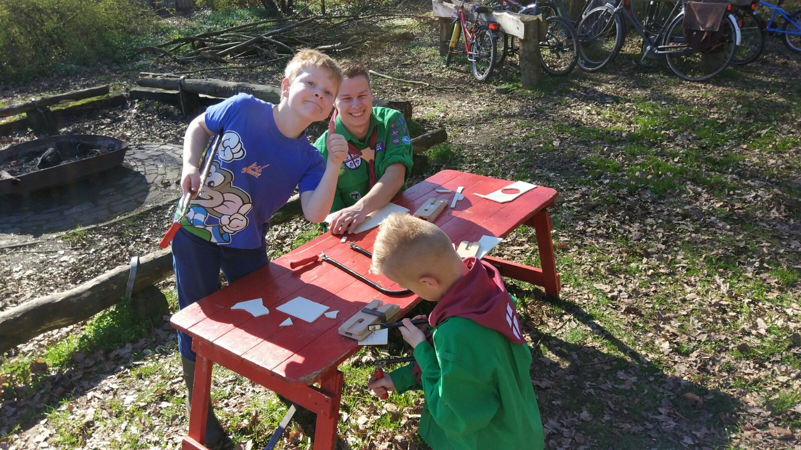 De welpen die al klaar waren mochten nog een sleutelhanger figuurzagen en versieren, er zijn ook een aantal stenen versierd! Andere welpen hebben nog in het bos gespeeld en een hut gebouwd. Toen iedereen klaar was hebben we nog een smokkelspel water, spons en vuur gespeeld. Daarna was het al weer tijd om te sluiten en naar huis te gaan.