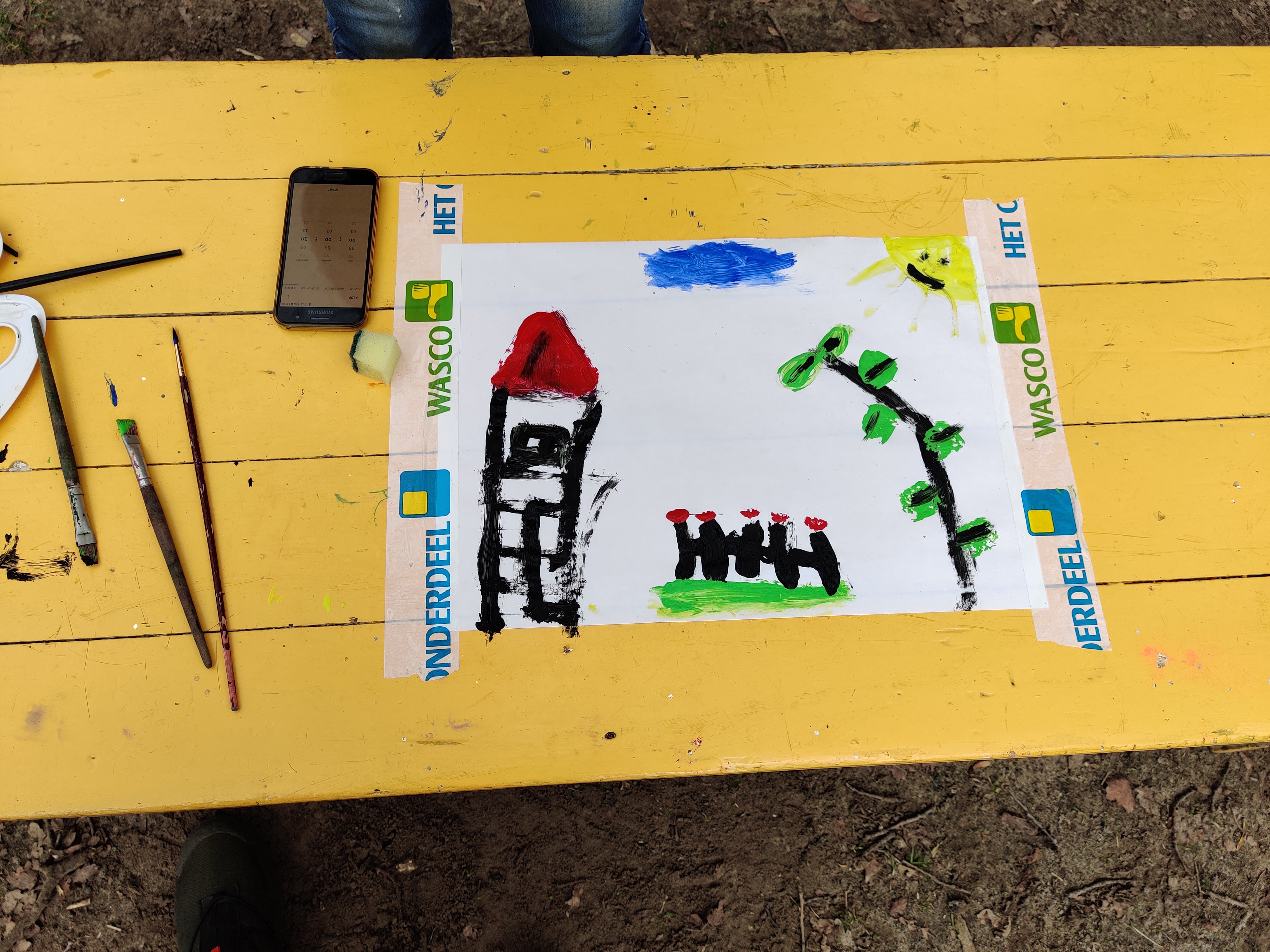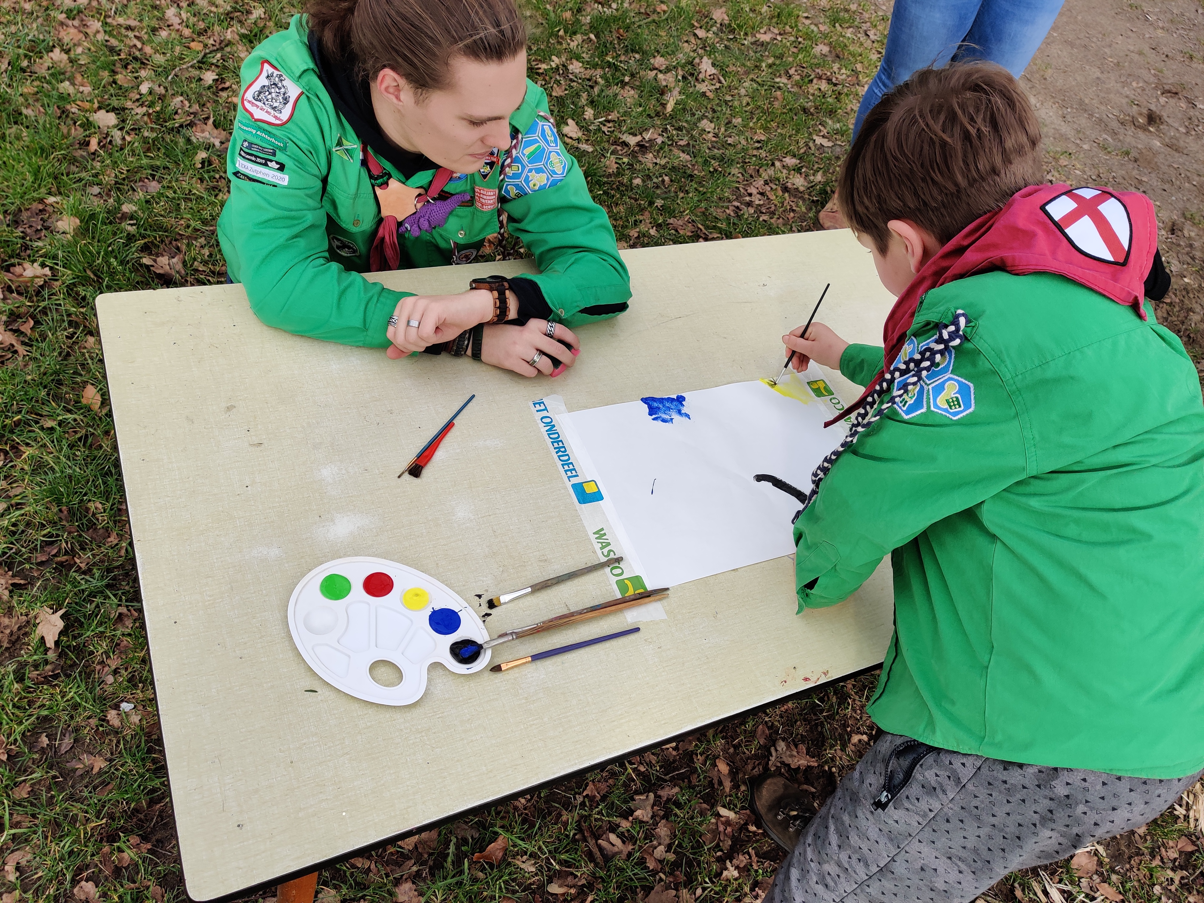 Deze week was de eerste opkomst die in het teken stond van een nieuw insigne; het kunstenaarsinsigne. Om de creatieve spieren eens op te warmen zijn we begonnen met een kunst-estafette. In twee teams legden de Welpen een kort parcours af waarna ze slechts 10 seconden hadden om met één kleur iets toe te voegen aan een steeds voller wordend canvas. Niet zomaar lukrake strepen of stippen, maar iets doelbewust. Want bij het begin van de estafette was een voorbeeldschilderij. Het team dat het dichtst bij het voorbeeld had geschilderd, was de winnaar.