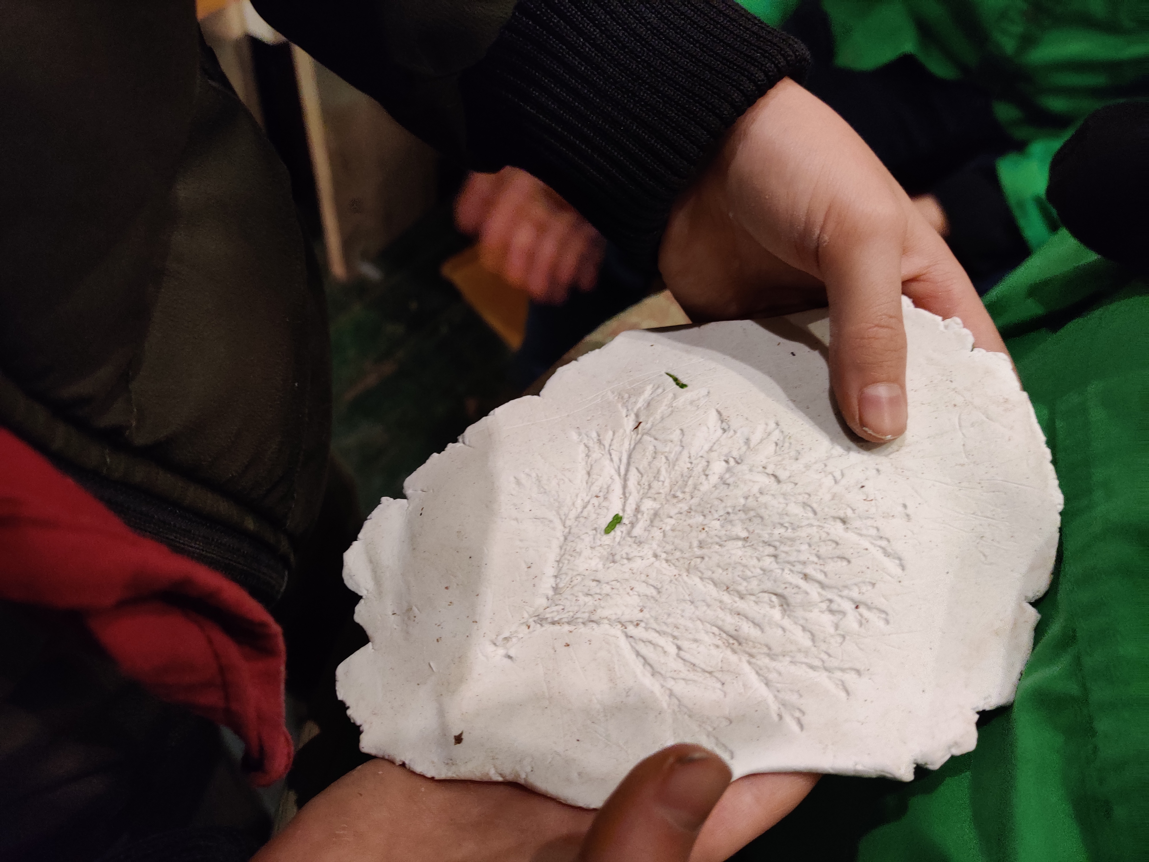 Takken van naaldbomen zijn erg geschikt om een afdruk van te maken in de klei. Als je de klei vervolgens uitsnijd in de vorm van een blad, lijkt het na het drogen net alsof het een blad van steen is. De klei die volgende week wel hard geworden is, gaan we dan mooi beschilderen.