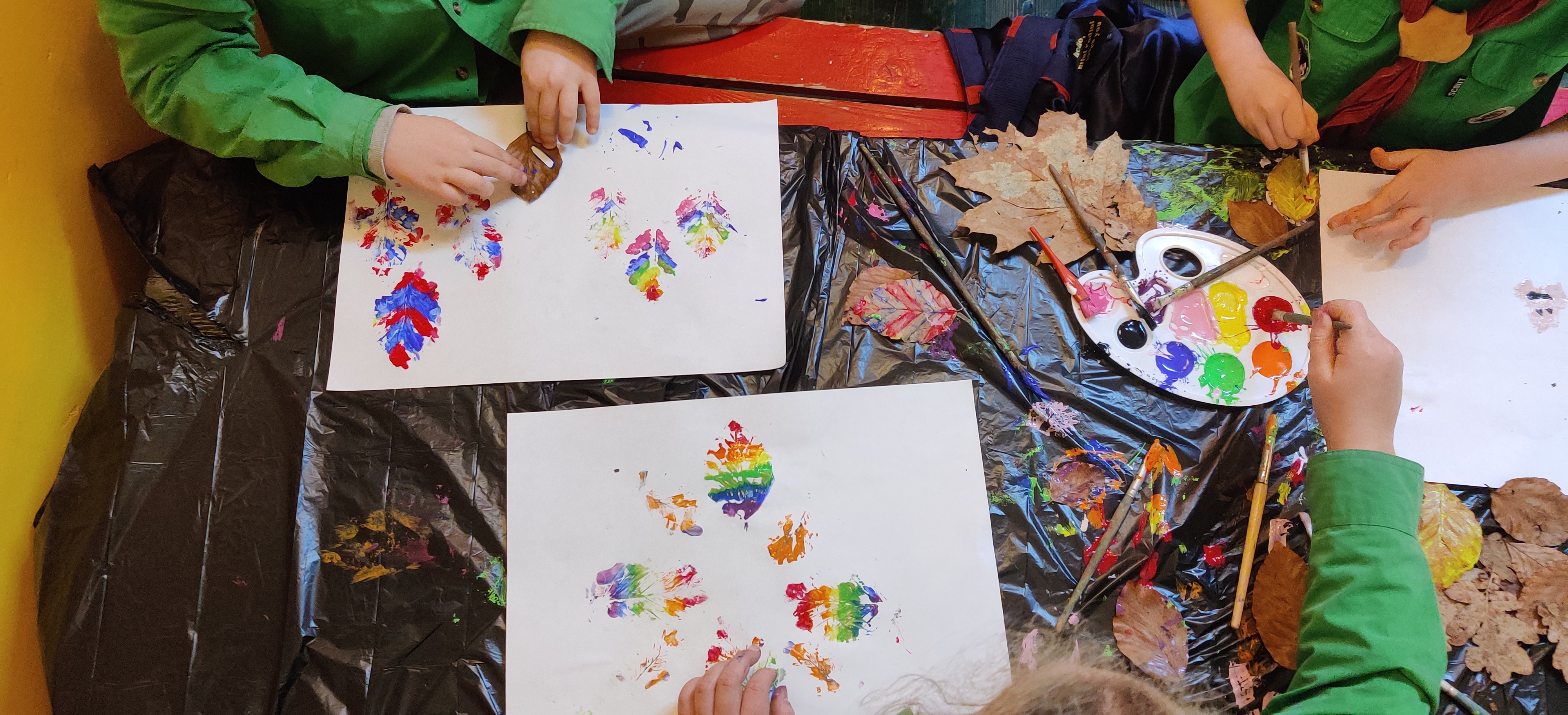 De rest van de opkomst werd in twee groepen kunst gemaakt met bladeren, die we vorige week alvast hadden verzameld. Door bladeren aan één kant met verf te bedekken kun je op een canvas mooie patronen maken.