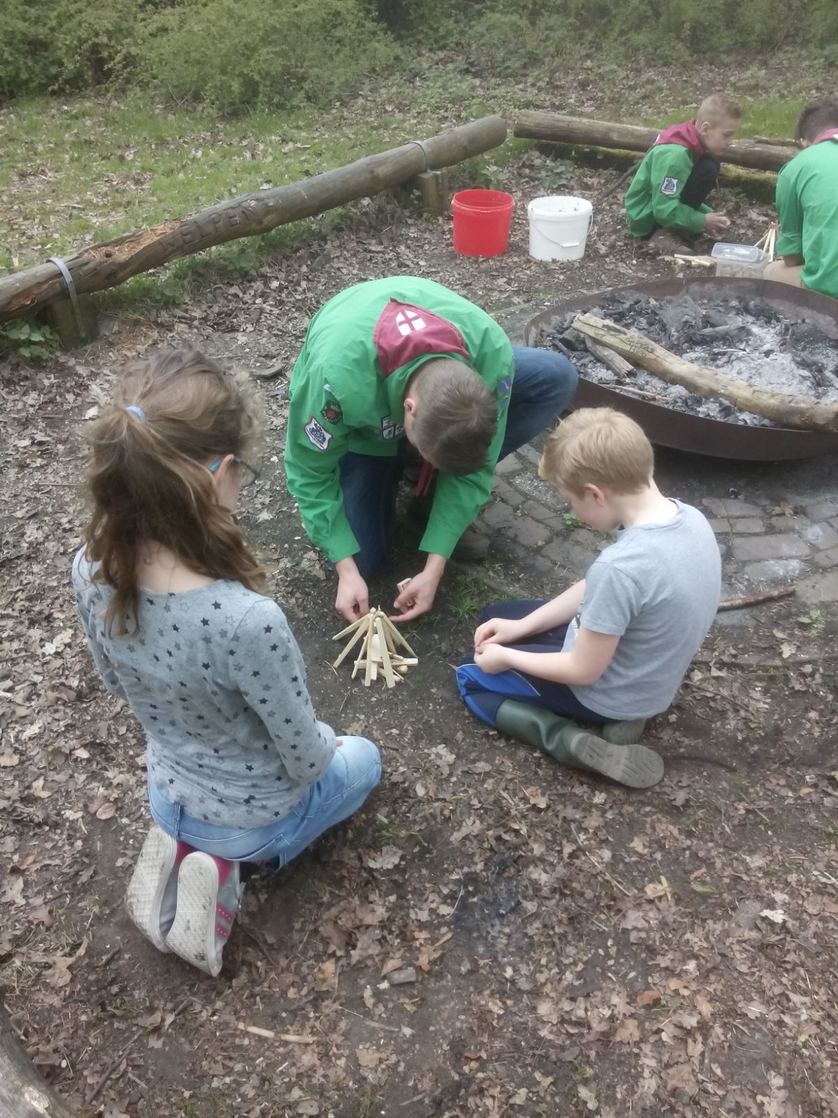Toen hebben we de groep opgesplitst in twee nesten. Het ene nest ging met Jelle, Martijn en Anne leren vuur maken en lekker marshmallows roosteren. Het andere nest ging met Cilia en Dieuwertje leren om een punt aan te stok te slijpen met een zakmes in het bos. Dit was dus een goed begin van het zakmes insigne. Hier gaan we de rest van de opkomsten ook mee verder. Halverwege de opkomst hebben de nesten geruild.