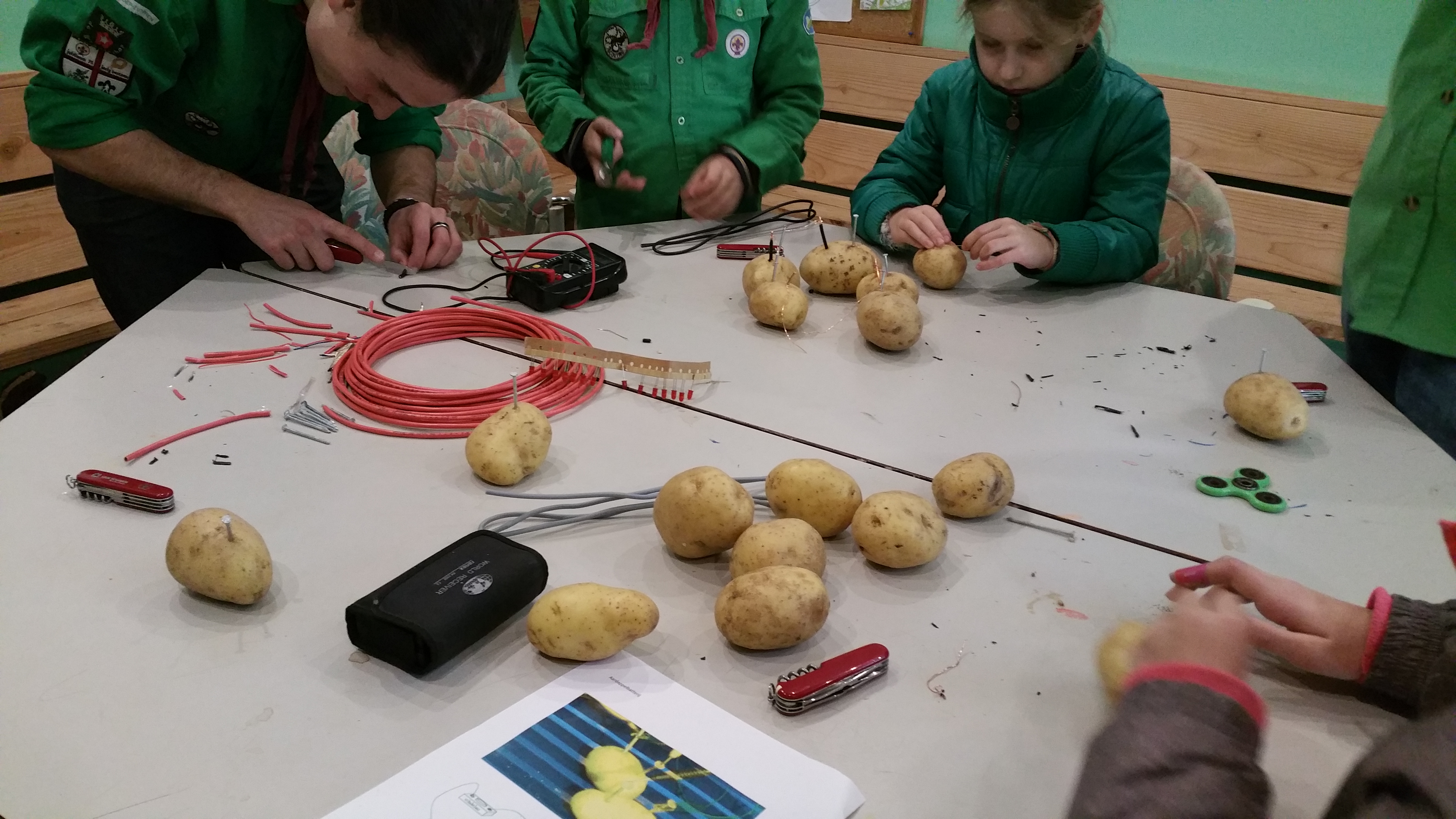 De andere groep begon met het project aardappelenergie. Door middel van ijzeren en koperen pinnetjes en koperdraad werden de aardappels aan elkaar gemaakt en werd er met een speciaal apparaat de energie gemeten. De eerste groep had een beetje pech, er waren nog niet genoeg aardappels. Maar met behulp van de volgende groep hebben we het lampje (heel licht maar toch!) kunnen laten branden!